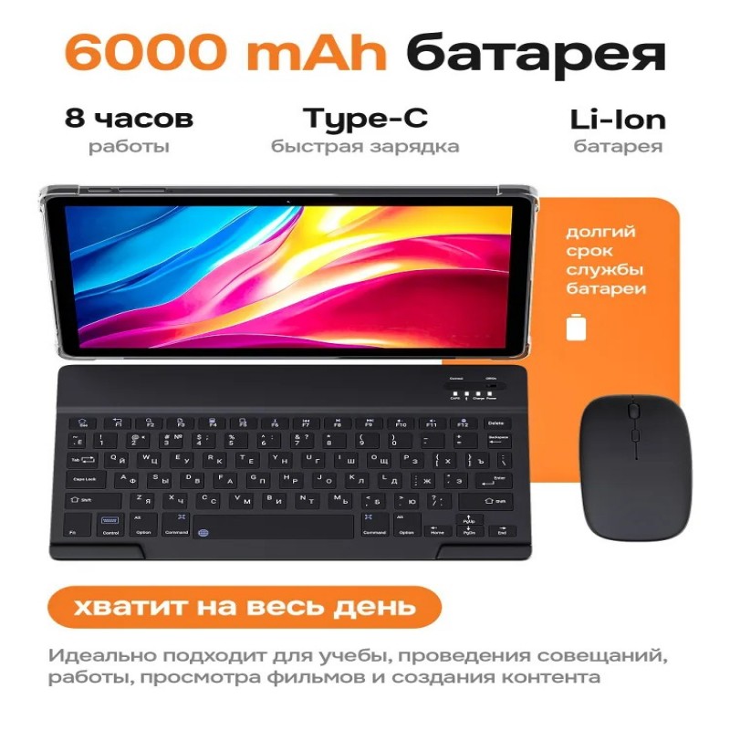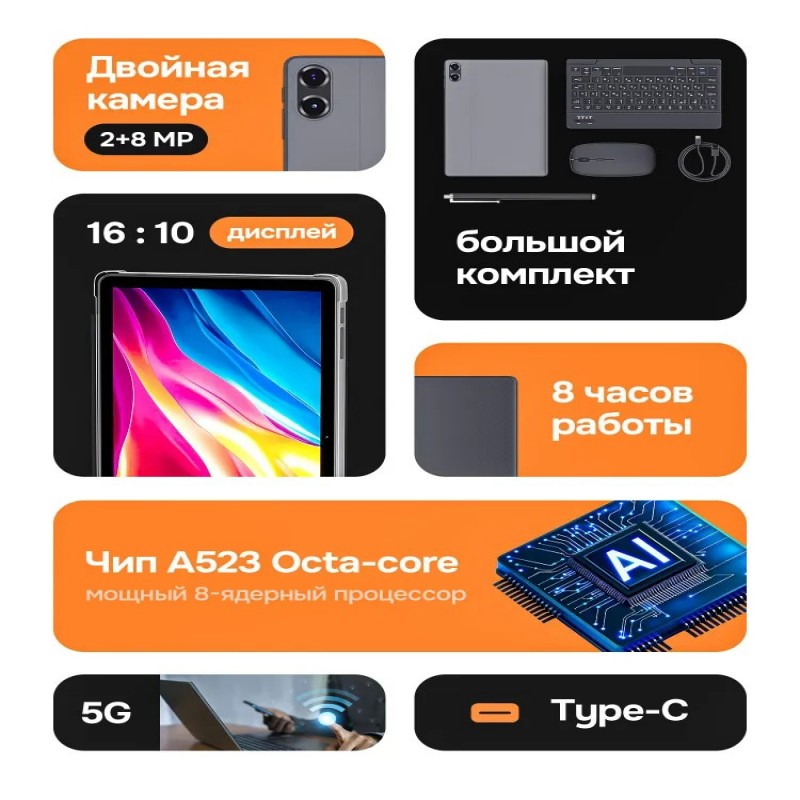 КомплектацияПланшет - 1 шт. / Блок питания - 1 шт. / USB кабель - 1 шт. / Инструкция - 1 шт. / microSD 128 GB - 1 шт. Клавиатура - 1 шт.