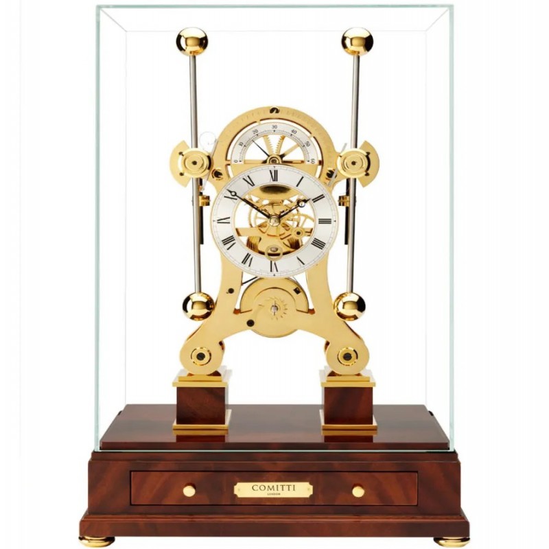 Часы настольные The Gold Plated Grasshopper, Comitti (Англия) лимитированная серия. Механизм 8-дневный завод, 2 компенсирующих маятника, часы покрыты золотом, циферблат отгравирован и покрыт серебром, оригинальный секундный циферблат – расположен выше основного циферблата на полукруге (180 градусов).