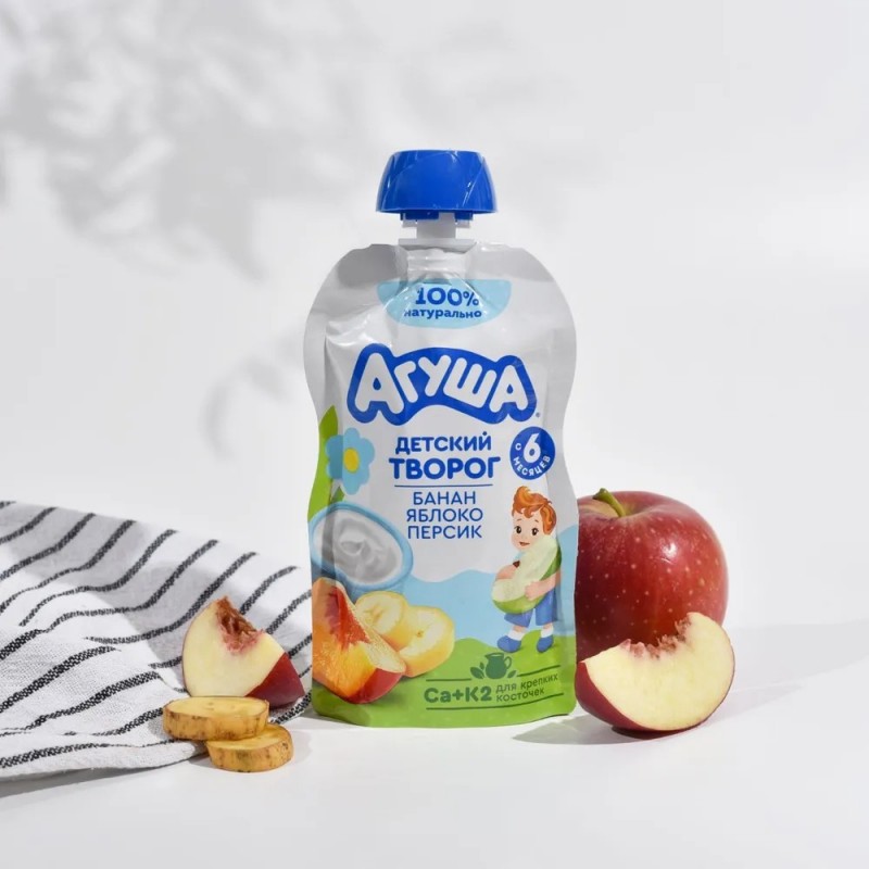 "Детский творог Агуша разработан как первый кисломолочный прикорм с 6 месяцев; оптимальным считается введение творога после овощей, безмолочных каш, фруктов. Творожок «Агуша» - это ценный источник полноценного молочного белка, легкоусвояемого кальция и витамина К2, которые так нужны, чтобы у малыша сформировались крепкие зубы и косточки. Творог в мягкой упаковке можно есть без ложки в дороге или на прогулке. Помимо творога «Агуша» предлагает кефир, ряженку, йогурт – это тоже важная часть рациона подрастающего малыша. • 100% натурально • Без добавления консервантов, сухого молока, искусственных ароматизаторов • К2+Ca для крепких косточек и здорового роста"
