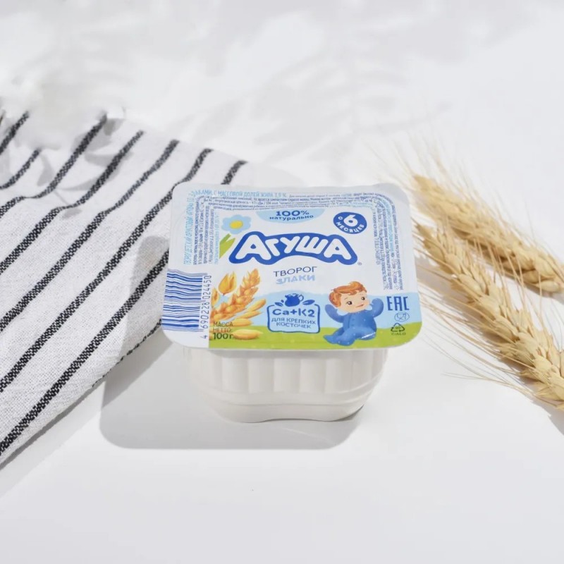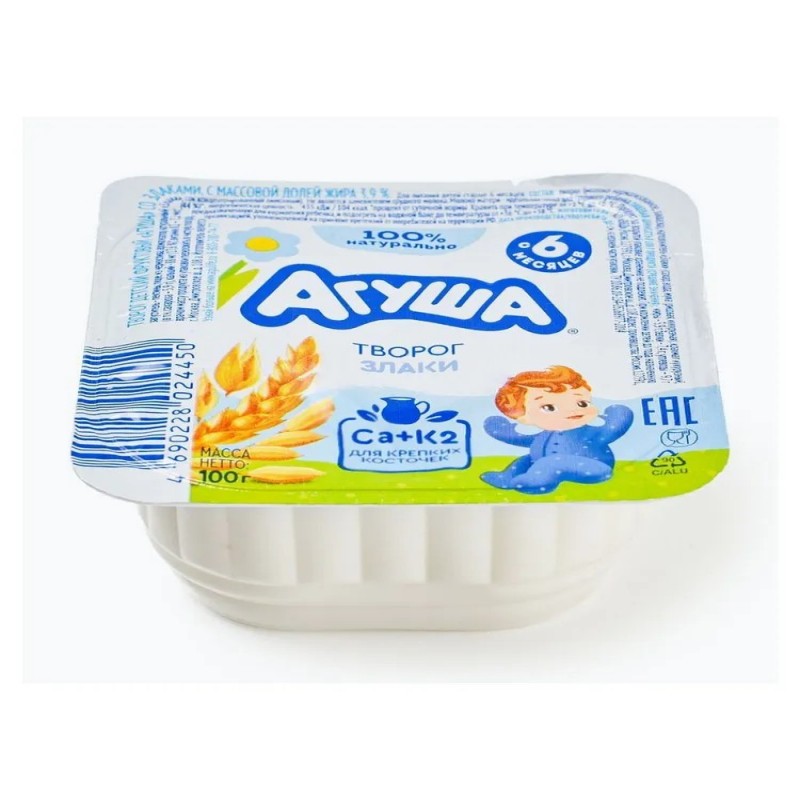 "Детский творог Агуша разработан как первый кисломолочный прикорм с 6 месяцев; оптимальным считается введение творога после овощей, безмолочных каш, фруктов. Творожок «Агуша» - это ценный источник полноценного молочного белка, легкоусвояемого кальция и витамина К2, которые так нужны, чтобы у малыша сформировались крепкие зубы и косточки. Помимо творога «Агуша» предлагает кефир, ряженку, йогурт – это тоже важная часть рациона подрастающего малыша. • 100% натурально • Без добавления консервантов, сухого молока, искусственных ароматизаторов • К2+Ca для крепких косточек и здорового роста"