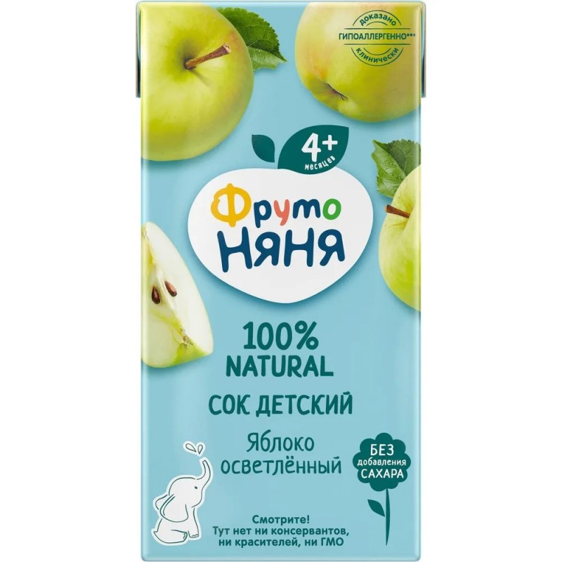 Условия хранения При температуре от +0°С до +25°С, в защищенном от солнца помещении, с относительной влажностью воздуха не более 75%. Состав Сок из яблок. Изготовлен из концентрированного сока. Детскими соками и нектарами "ФрутоНяня" становятся натуральные, отборные фрукты, ягоды и овощи. Они обеспечивают вашего малыша природной пользой и энергией для гармоничного роста и развития. Бережная технология приготовления сохраняет природную пользу фруктов, ягод и овощей. Современное производство соответствует высоким стандартам безопасности и качества.
