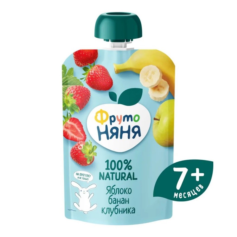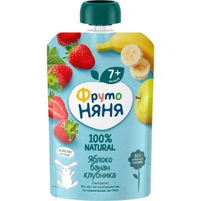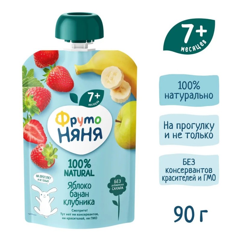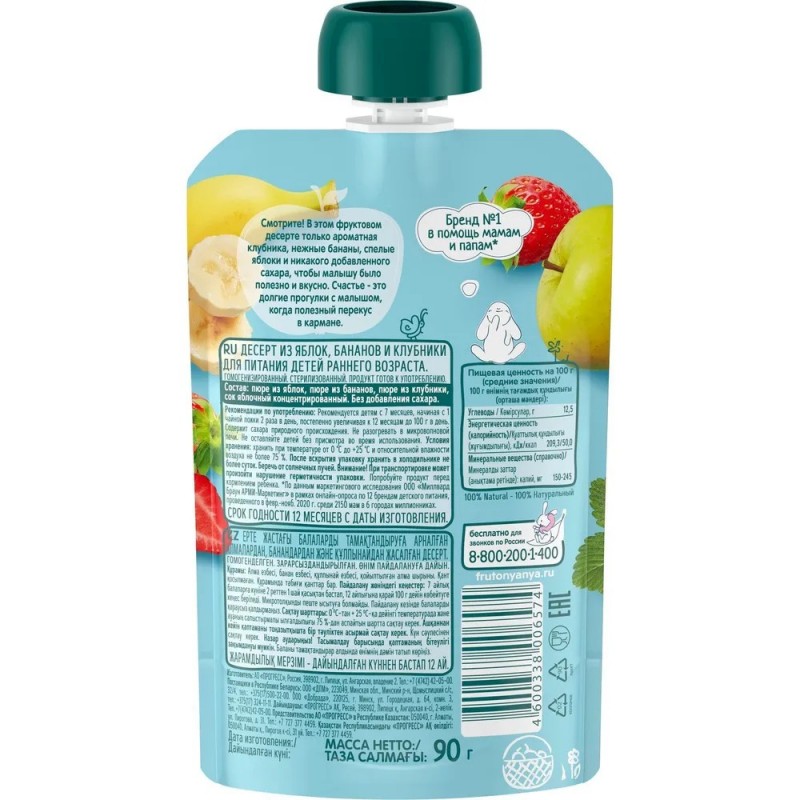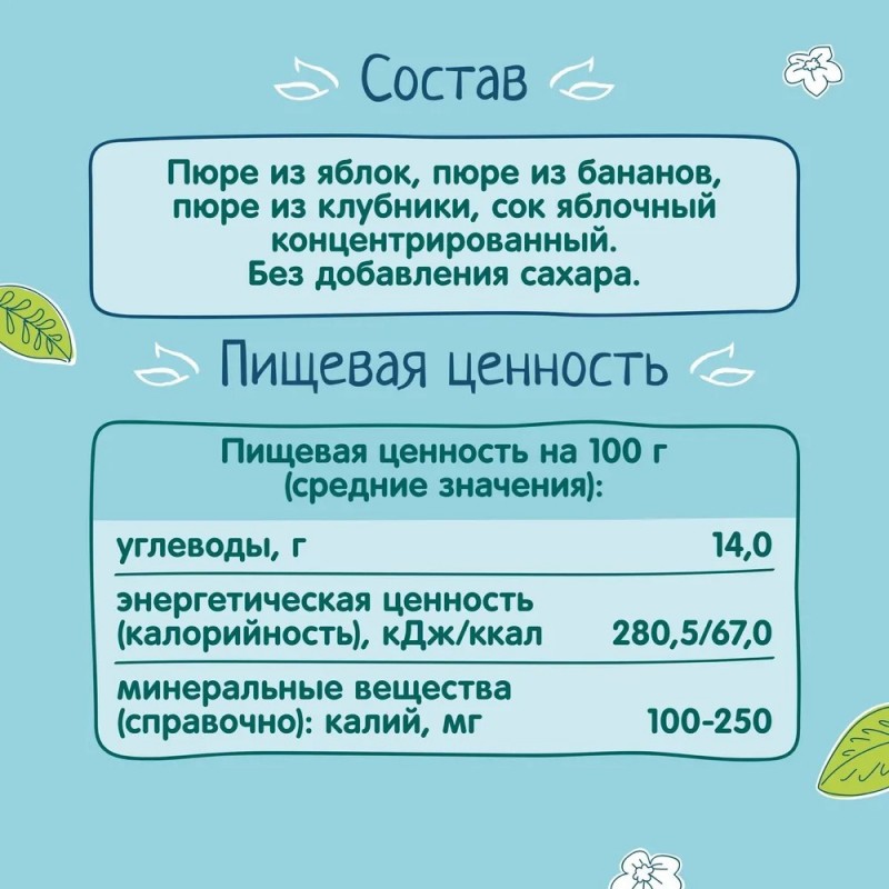 Пюре из яблок концентрированное, пюре из бананов, сок из клубники концентрированный, пюре из клубники, вода питьевая специально подготовленная.