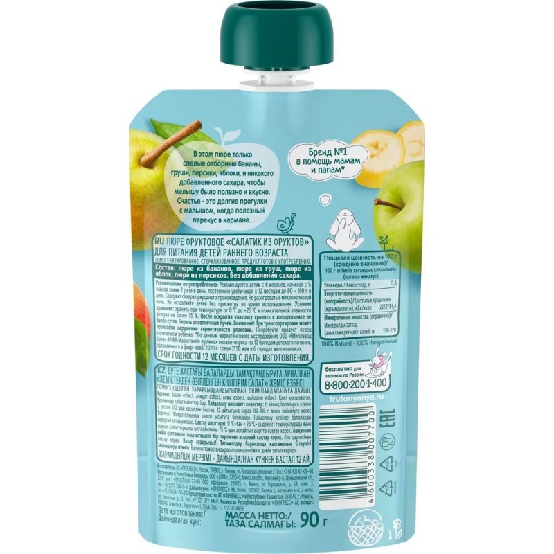 Пюре из бананов, пюре из груш, пюре из яблок, пюре из персиков. Без добавления сахара. Содержит сахара природного происхождения. Продукт изготовлен из концентрированных грушевого и персикового пюре.