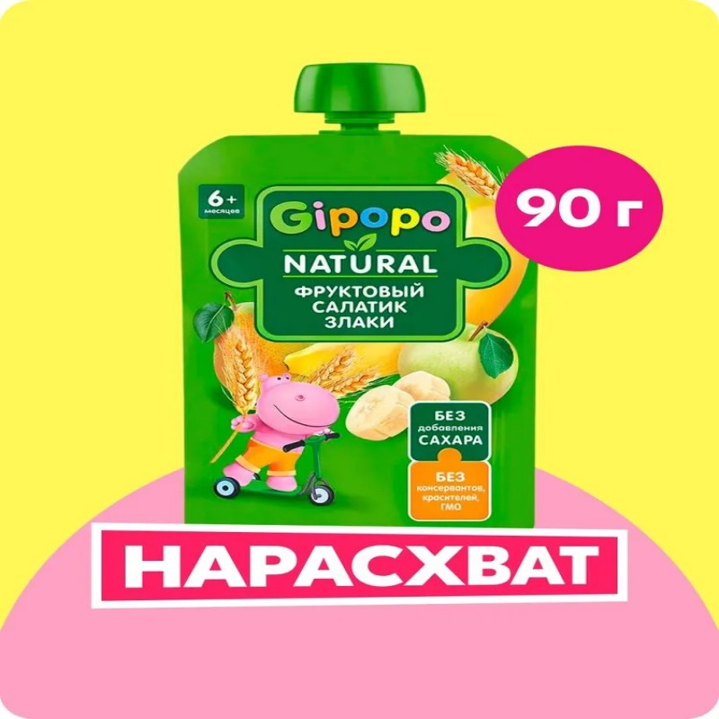 В состав пюре «Фруктовый салатик и злаки» GIPOPO входят только натуральные пюре из фруктов и злаки – рисовая, овсяная и гречневая мука.
