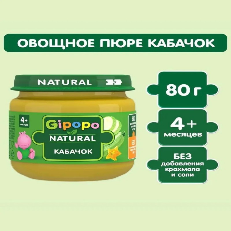 Пюре овощное детское из кабачка GIPOPO создано для первого прикорма малышей с 4 месяцев. Кабачки отлично подходят для знакомства малыша с овощами. Кабачок богат клетчаткой, природными витаминами, минералами для полноценного роста и развития. Детское пюре овощное GIPOPO: - Оптимально для первого прикорма - Без добавления крахмала и соли - Без красителей, консервантов, ароматизаторов и ГМО - Однородная консистенция Попробуйте также фруктовые пюре GIPOPO c 4-х месяцев. Создано экспертами, одобрено мамами.