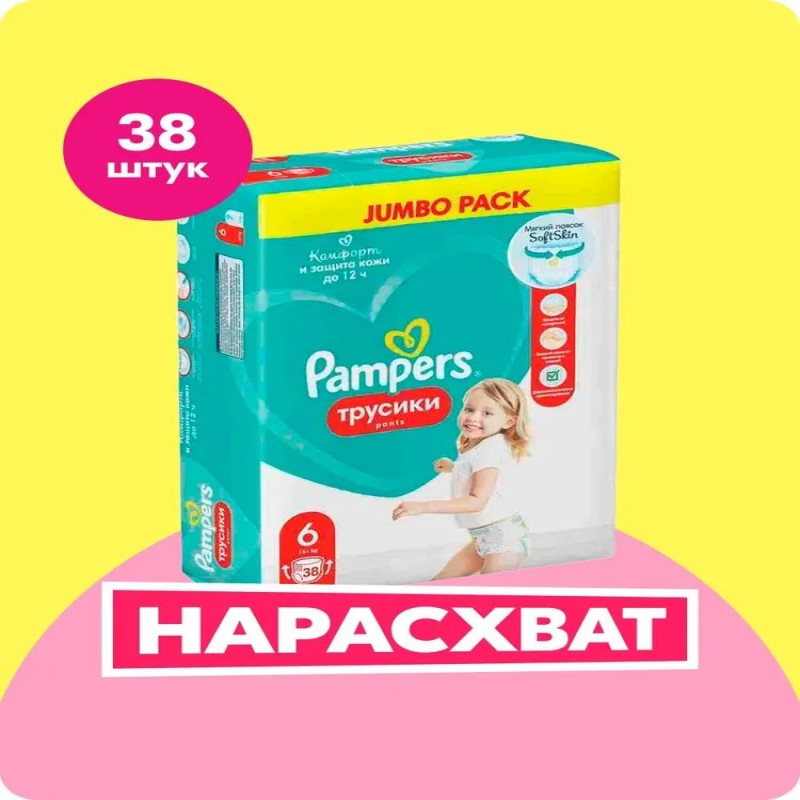 Подгузники трусики Pampers 6 размер, 15+ кг, 38 шт, с мягким пояском