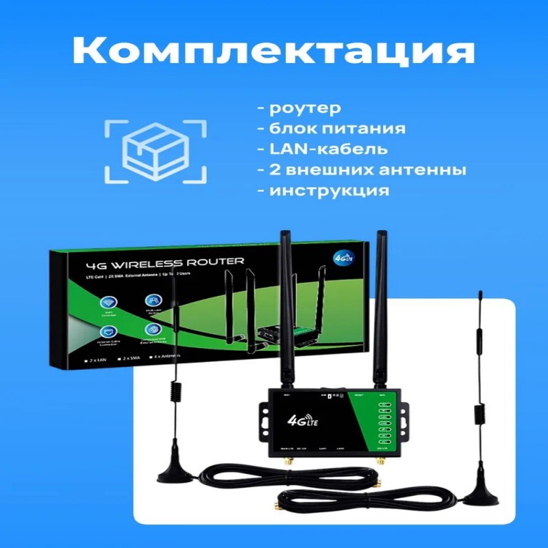 КомплектацияРоутер; блок питания; внешние выносные антенны 2шт; Lan провод