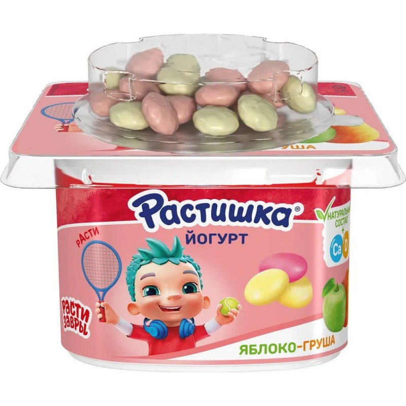 Йогурт Растишка Яблоко-груша с печеньем в шоколаде, 3%, 118 г рекомендуется для детей старше 3х лет. В продукте только натуральные ингредиенты плюс кальций и витамин D3, необходимые для здорового роста и развития ребенка. Печенье сделано из пшеничной муки и покрыто сверху белым и розовым шоколадом (топпер под крышечкой). Необычный формат позволяет детям самим решать, смешивать йогурт с печеньем или есть отдельно.