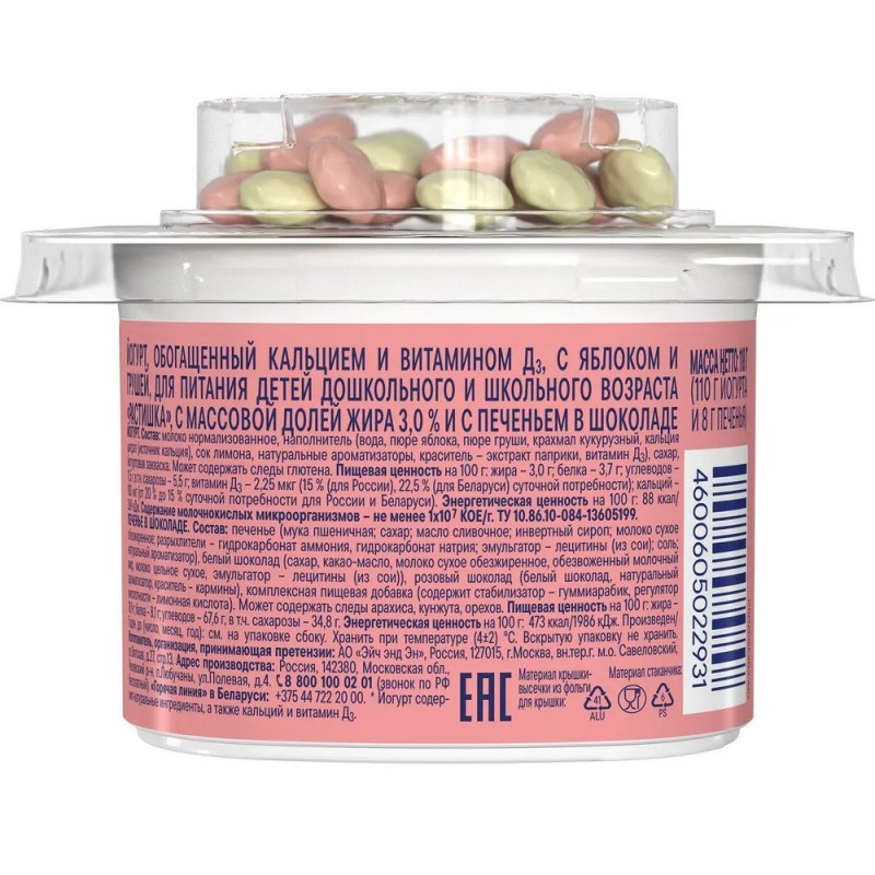СОСТАВ ЙОГУРТА: МОЛОКО НОРМАЛИЗОВАННОЕ НАПОЛНИТЕЛЬ ВОДА КОНЦЕНТРИРОВАННОЕ ПЮРЕ ЯБЛОКА КУКУРУЗНЫЙ КРАХМАЛ КОНЦЕНТРИРОВАННОЕ ПЮРЕ ГРУШИ КАЛЬЦИЙ КАЛЬЦИЯ ЦИТРАТ КОНЦЕНТРИРОВАННЫЙ СОК ЛИМОНА НАТУРАЛЬНЫЕ АРОМАТИЗАТОРЫ КРАСИТЕЛЬ – ЭКСТРАКТ ПАПРИКИ ВИТАМИН Д3 САХАР ЙОГУРТОВАЯ ЗАКВАСКА МОЖЕТ СОДЕРЖАТЬ СЛЕДЫ ГЛЮТЕНА И ОРЕХОВ СОСТАВ ПЕЧЕНЬЯ: ПЕЧЕНЬЕ МУКА ПШЕНИЧНАЯ; САХАР; МАСЛО СЛИВОЧНОЕ; ИНВЕРТНЫЙ СИРОП; МОЛОКО СУХОЕ ОБЕЗЖИРЕННОЕ; РАЗРЫХЛИТЕЛИ – ГИДРОКАРБОНАТ АММОНИЯ ГИДРОКАРБОНАТ НАТРИЯ; ЭМУЛЬГАТОР – ЛЕЦИТИНЫ ИЗ СОИ ; СОЛЬ; НАТУРАЛЬНЫЙ АРОМАТИЗАТОР БЕЛЫЙ ШОКОЛАД САХАР КАКАО-МАСЛО МОЛОКО СУХОЕ ОБЕЗЖИРЕННОЕ ОБЕЗВОЖЕННЫЙ МОЛОЧНЫЙ ЖИР МОЛОКО ЦЕЛЬНОЕ СУХОЕ ЭМУЛЬГАТОР – ЛЕЦИТИНЫ ИЗ СОИ РОЗОВЫЙ ШОКОЛАД БЕЛЫЙ ШОКОЛАД НАТУРАЛЬНЫЙ АРОМАТИЗАТОР КРАСИТЕЛЬ – КАРМИНЫ КОМПЛЕКСНАЯ ПИЩЕВАЯ ДОБАВКА СОДЕРЖИТ СТАБИЛИЗАТОР – ГУММИАРАБИК РЕГУЛЯТОР КИСЛОТНОСТИ – ЛИМОННАЯ КИСЛОТА