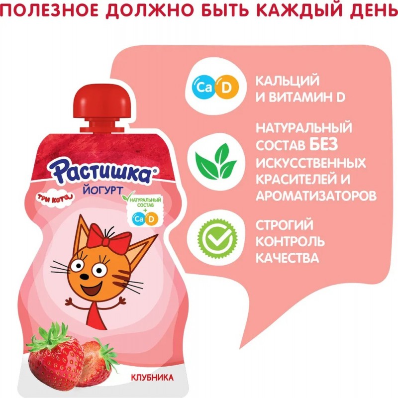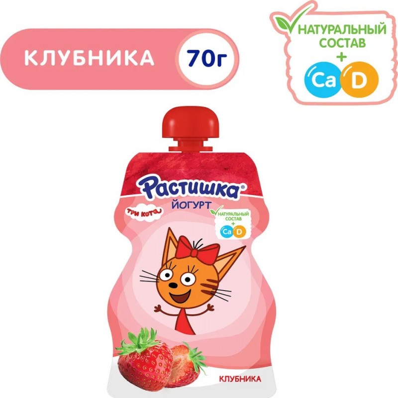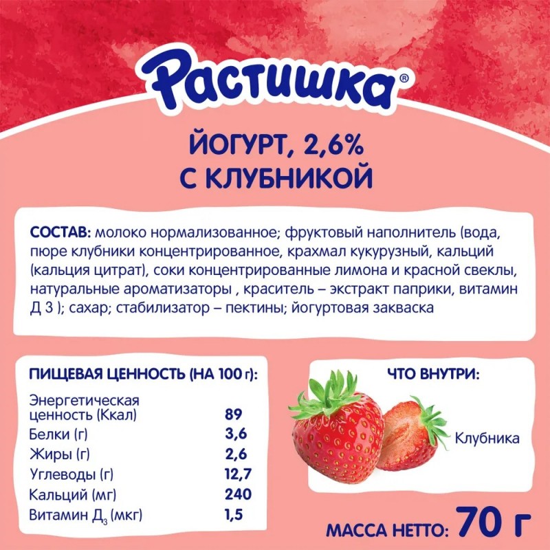 Йогурт питьевой Растишка для детей Клубника, 2,6%, 70 г рекомендуется для детей старше 3х лет. В йогурте только натуральные ингредиенты плюс кальций и витамин D3, необходимые для здорового роста и развития ребенка. Йогурт в удобной непроливающейся упаковке станет отличным перекусом, его можно взять с собой на прогулку или в гости.