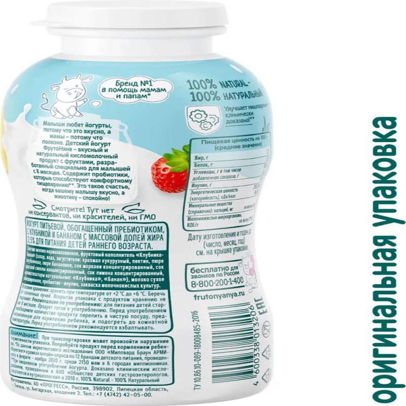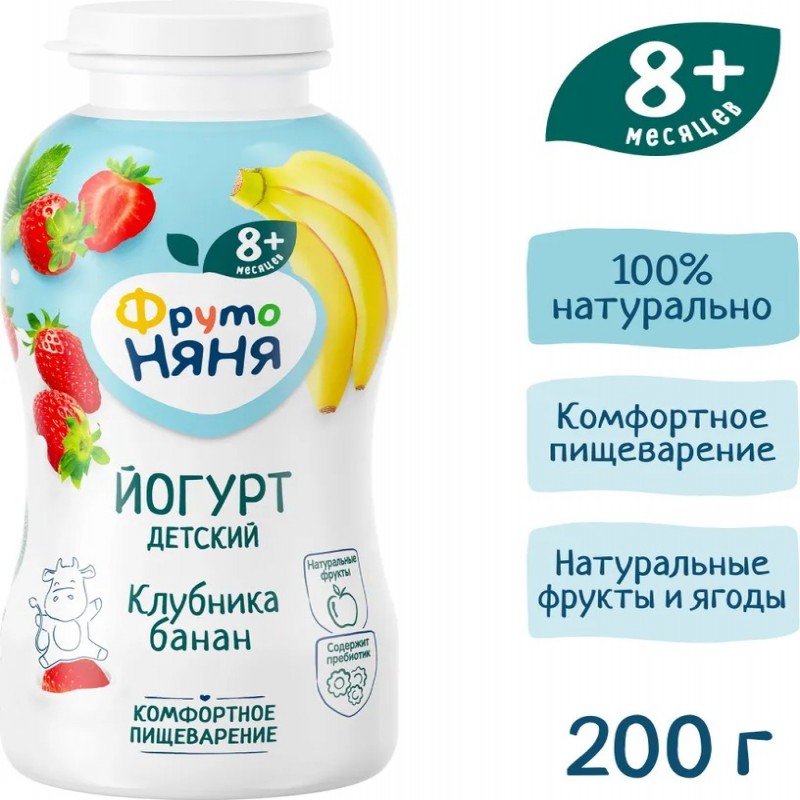 Детские биойогурты "ФрутоНяня" - это настоящий симбиотические продукты! Детские биойогурты "ФрутоНяня" изготовлены из свежего молока с использованием специальной закваски из термофильных молочнокислых стрептококков и болгарской молочнокислой палочки, содержат природный кальций, необходимый для правильного формирования костей и здоровья зубов. Биойогурты "ФрутоНяня" дополнительно обогащены полезными бифидобактериями ВВ12 (пробиотиками) которые в сочетании с инулином (натуральным пребиотиком) помогают формированию правильного микробиома в кишечнике малыша, способствую пищеварению и поддержанию защитных сил организма. Биойогурты "ФрутоНяня" обладают нежной консистенцией и могут быть включены в ежедневный рацион питания малышей старше 8 месяцев, в качестве кисломолочного напитка – альтернативе кефира, после консультации с педиатром. Cодержат натуральные пюре из фруктов и ягод и помогают познакомить маленьких гурманов с новыми вкусами и сформировать правильные пищевые привычки.