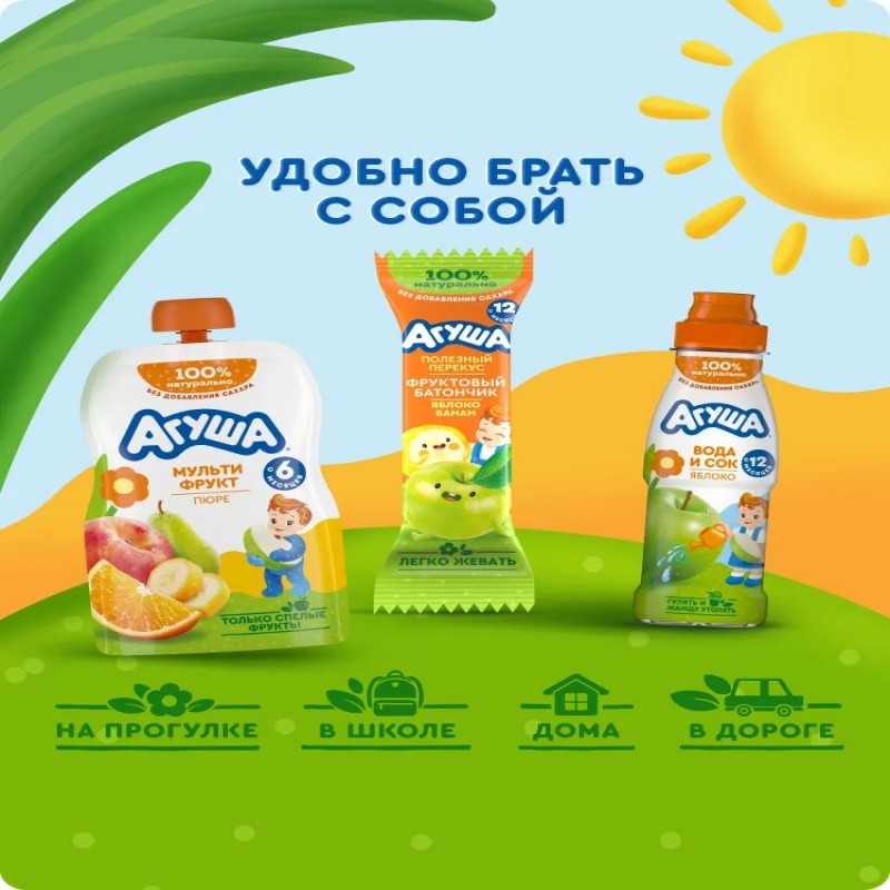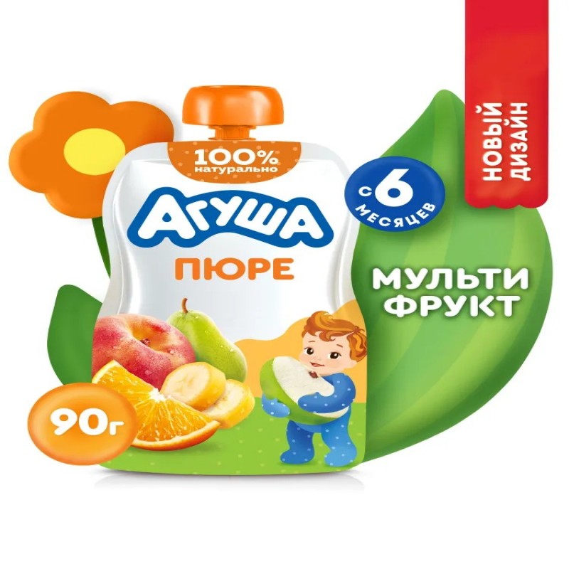 Детское фруктовое пюре Агуша из яблока, персика, груши, банана разработано для питания детей с 6 месяцев. Минимально допустимый возраст знакомства с фруктовым пюре определяется рекомендациями по срокам введения конкретных фруктов. Начинать вводить фрукты в прикорм необходимо с гипоаллергенных монокомпонентных пюре из яблок или груш и уже после того, как малыш познакомился с детскими кашами, овощными и мясными пюре. Пюре детское фруктовое Агуша - это детское питание, которое разнообразит рацион малыша. •100% натурально •Только спелые фрукты •Без добавления сахара •Без добавления консервантов, красителей, ароматизаторов •Мягкая упаковка удобна дома и на прогулке