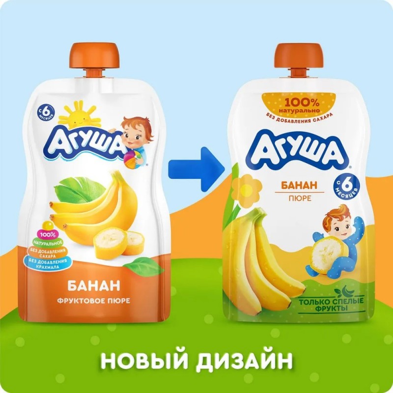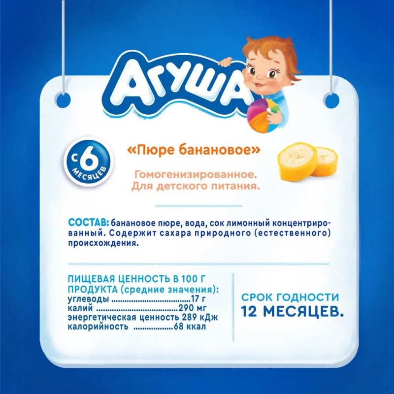 Детское фруктовое пюре Агуша разработано для питания детей с 4–6 месяцев. Минимально допустимый возраст знакомства с фруктовым пюре определяется рекомендациями по срокам введения конкретных фруктов. Начинать вводить фрукты в прикорм необходимо с гипоаллергенных монокомпонентных пюре из яблок или груш и уже после того, как малыш познакомился с детскими кашами, овощными и мясными пюре. Бананы имеют приятный вкус. Детское питание Агуша поможет разнообразить рацион. • 100% натурально • Только спелые фрукты • Без добавления сахара •Без добавления консервантов, красителей, ароматизаторов • Мягкая упаковка удобна дома и на прогулке