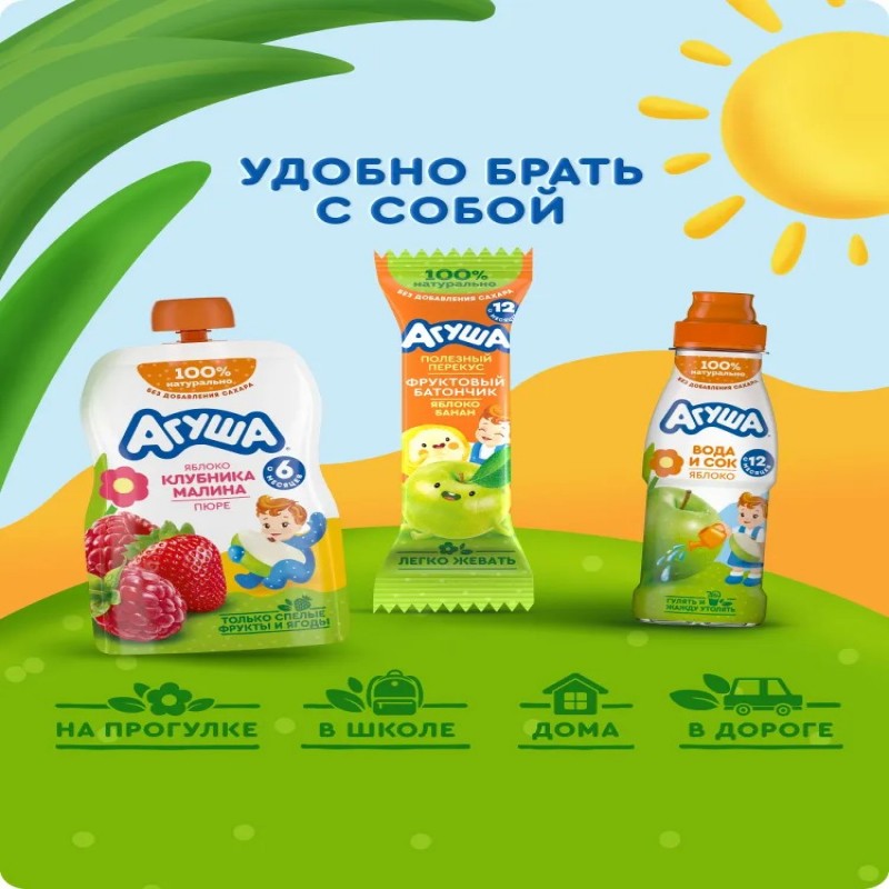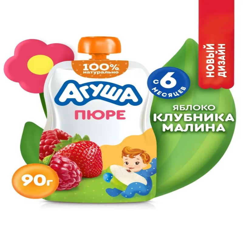 Детское фруктово-ягодное пюре Агуша с яблоком, клубникой и малиной разработано для питания детей с 6 месяцев. Минимально допустимый возраст знакомства с фруктовым пюре определяется рекомендациями по срокам введения конкретных фруктов. Начинать вводить фрукты в прикорм необходимо с гипоаллергенных монокомпонентных пюре из яблок или груш и уже после того, как малыш познакомился с детскими кашами, овощными и мясными пюре. Пюре детское Агуша - это детское питание, которое разнообразит рацион малыша. • 100% натурально • Спелые фрукты и ягоды • Без добавления сахара • Без добавления консервантов, красителей, ароматизаторов • Мягкая упаковка удобна дома и на прогулке