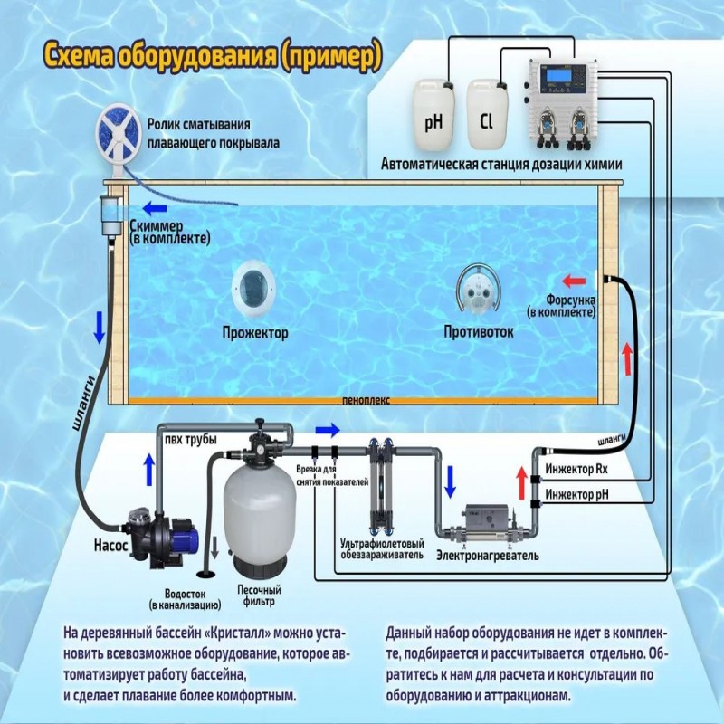 Комплектация Комплектация: Деревянный каркас Чашковый ПВХ пакет Лестница металлическая Скиммер Форсунка Металлические распорки *система фильтрации, подогрев воды и другое оборудование подбирается отдельно