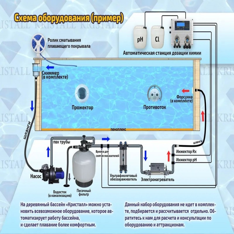 Комплектация Комплектация: Деревянный каркас Чашковый ПВХ пакет Лестница металлическая Скиммер Форсунка Металлические распорки *система фильтрации, подогрев воды и другое оборудование подбирается отдельно