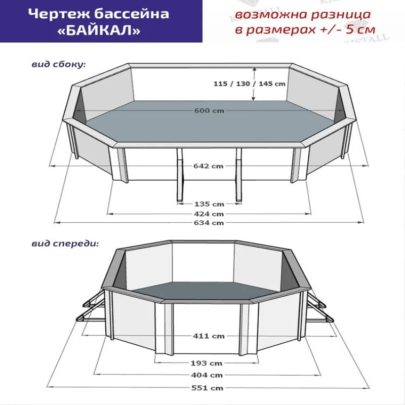Комплектация Комплектация: Деревянный каркас Чашковый ПВХ пакет Лестница металлическая Скиммер Форсунка Металлические распорки *система фильтрации, подогрев воды и другое оборудование подбирается отдельно
