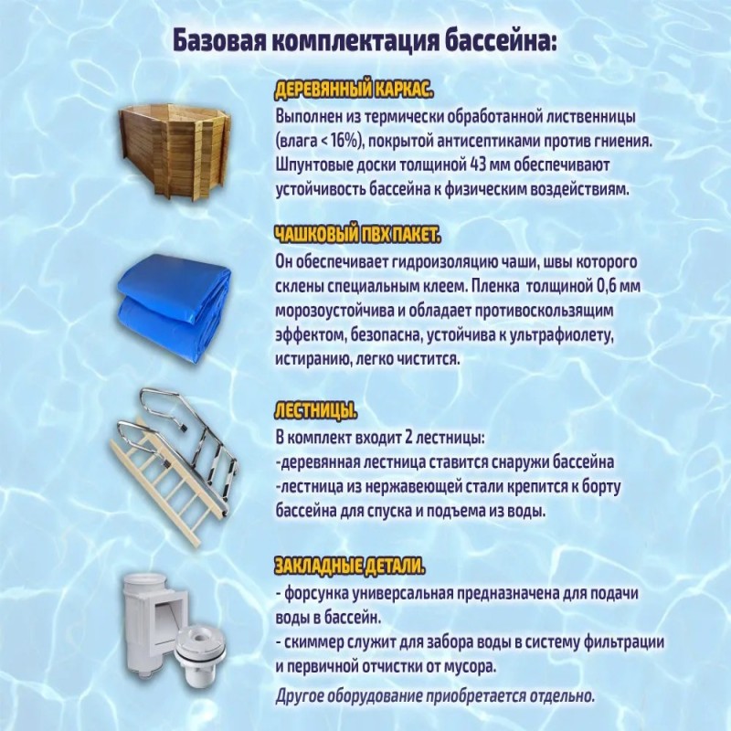 Комплектация Комплектация: Деревянный каркас Чашковый ПВХ пакет Лестница металлическая Скиммер Форсунка Металлические распорки *система фильтрации, подогрев воды и другое оборудование подбирается отдельно