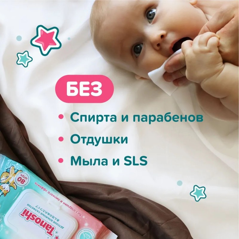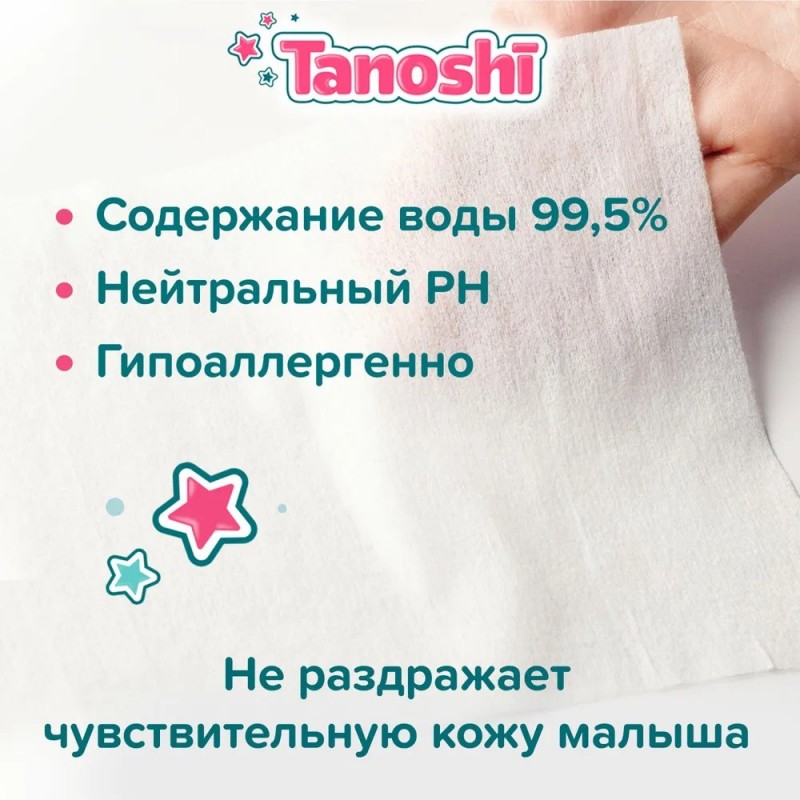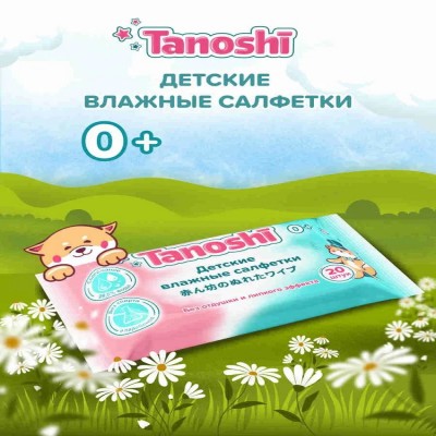 Детские влажные салфетки Tanoshi – удобный, быстрый и безопасный способ очистить и освежить чувствительную кожу ребёнка с рождения. Подходят для ежедневной деликатной интимной гигиены малышей с первых дней жизни, помогают быстро освежить ручки, ножки и лицо ребёнка. Изготовлены из гипоаллергенного, мягкого и плотного нетканого волокна, не рвутся и не оставляют ворсинок на лице и теле. Пропитывающий лосьон очищающих салфеток Таноши на 99,5% состоит из чистой воды, не содержит спирта, парабенов, отдушек и мылящих компонентов. Освежающий состав пропитки влажных салфеток не сушит кожу, сохраняет её естественный уровень pH, не имеет запаха и не оставляет липкости на нежной коже ребёнка и руках мамы. Компактную упаковку флоу-пак с 20 салфетками удобно брать с собой на прогулку и в поликлинику, положить в карман, в коляску или в дамскую сумочку. Влажные салфетки Tanoshi помогут в любой ситуации, когда требуется быстрое и эффективное очищение кожи, а воды и мыла нет под рукой. Разработаны для комфортного, простого и удобного использования мамой, папой и детьми. Подойдут не только во время смены подгузника, но и для всей семьи на пикнике, для школьного рюкзака, для снятия лёгкого макияжа и интимной гигиены мамы. Размер одной салфетки 20*12,5 см. Tanoshi – это бренд для молодых мам и пап, которые стремятся наладить свой быт так, чтобы освободить время не только для игр и развития малыша, но и для собственных увлечений и встреч с друзьями. Они не боятся пробовать новое и выбирают то, что сделает уход за малышом и его развитие более функциональными, лёгкими и менее затратными по времени и бюджету. Мы знаем, что быть родителем – это не всегда идеальная картинка. Но мы рады, что вы выбрали этот путь, и хотим вас поддержать. Поэтому мы создаем безопасные товары для ваших малышей, в качестве и справедливой цене которых вы можете быть уверены. Tanoshi – потому что вы лучшие родители для своего малыша.
