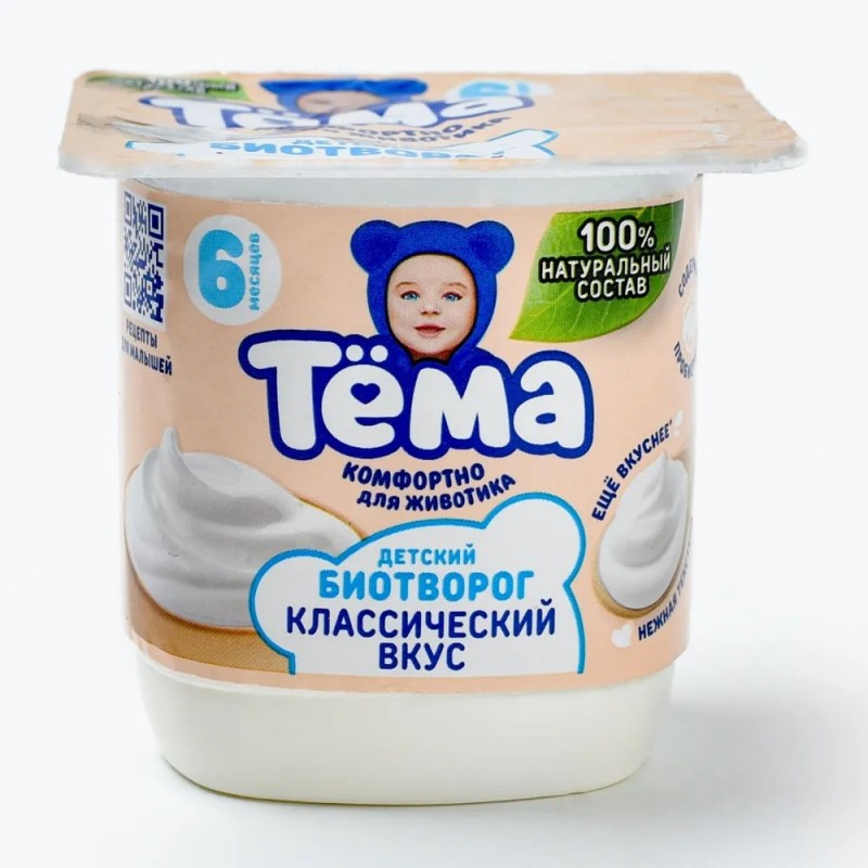 Детский творог «Тёма» изготовлен из отборного молока от проверенных поставщиков. Натуральные ингредиенты. Содержит бифидобактерии. Производится из свежего молока, которое каждый день привозят с местных ферм. Проходит строгий контроль качества на всех этапах производства. Тёма. Говорим как есть. В период с 22.05.2023 по 01.11.2023 продукты «Тёма» в заказе могут приходить с дизайнами упаковки с разными именами малышей. Выбор конкретного имени на упаковке при заказе продуктов недоступен