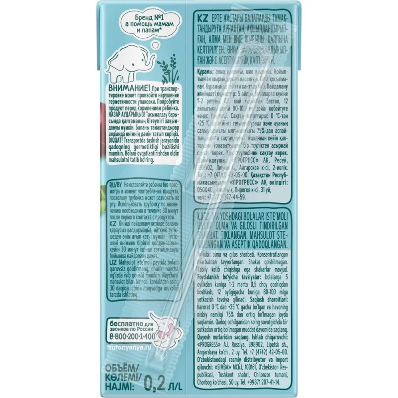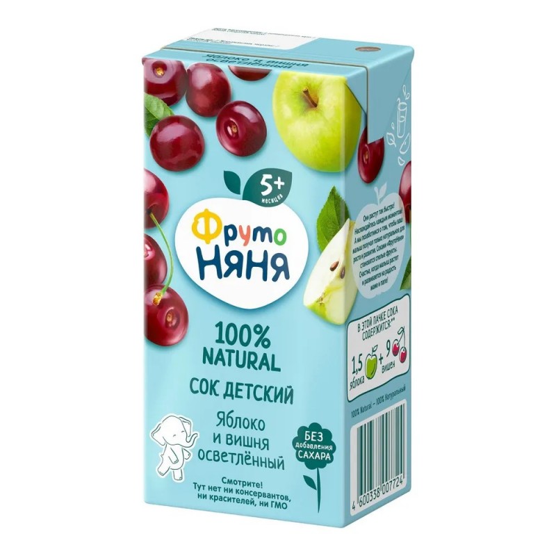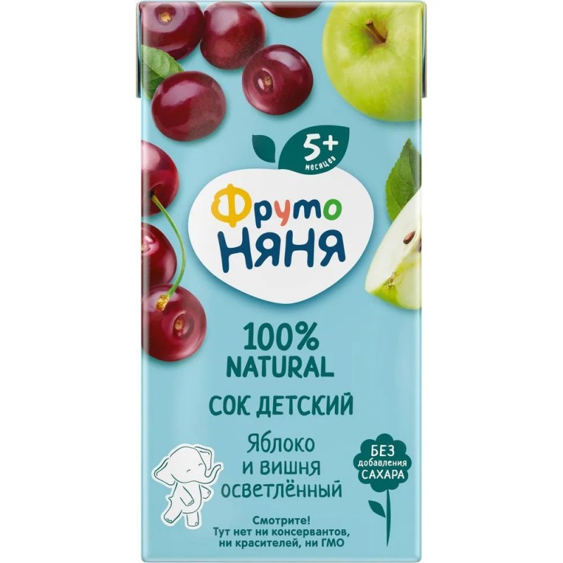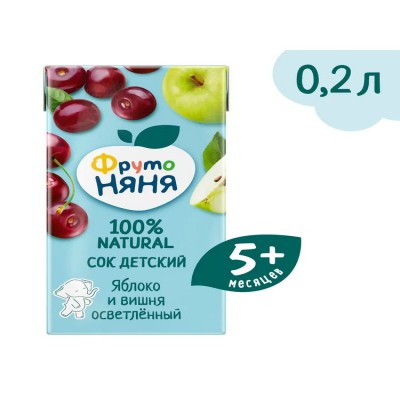 Условия хранения При температуре от +1`С до +25`С, в защищенном от солнца помещении, с относительной влажностью воздуха не более 75% Состав Сок из яблок, сок из вишни. Изготовлен из концентрированных соков. Без добавления сахара. Содержатся сахара природного происхождения. Детскими соками и нектарами "ФрутоНяня" становятся натуральные, отборные фрукты, ягоды и овощи. Они обеспечивают вашего малыша природной пользой и энергией для гармоничного роста и развития. Бережная технология приготовления сохраняет природную пользу фруктов, ягод и овощей. Современное производство соответствует высоким стандартам безопасности и качества.