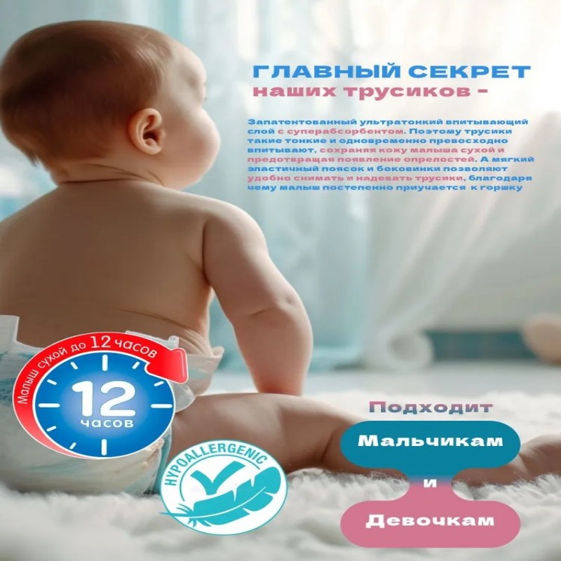 Анатомическая T-образная форма и специальные оборочки обеспечивают идеальное облегание, не натирают и не стесняют движений, позволяя малышу свободно играть и двигаться. Эластичный поясок надежно фиксирует трусики на теле, а двойные мягкие резиночки защищают от протеканий, обеспечивая комфорт и спокойствие на протяжении всего дня и ночи.
