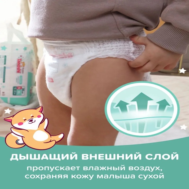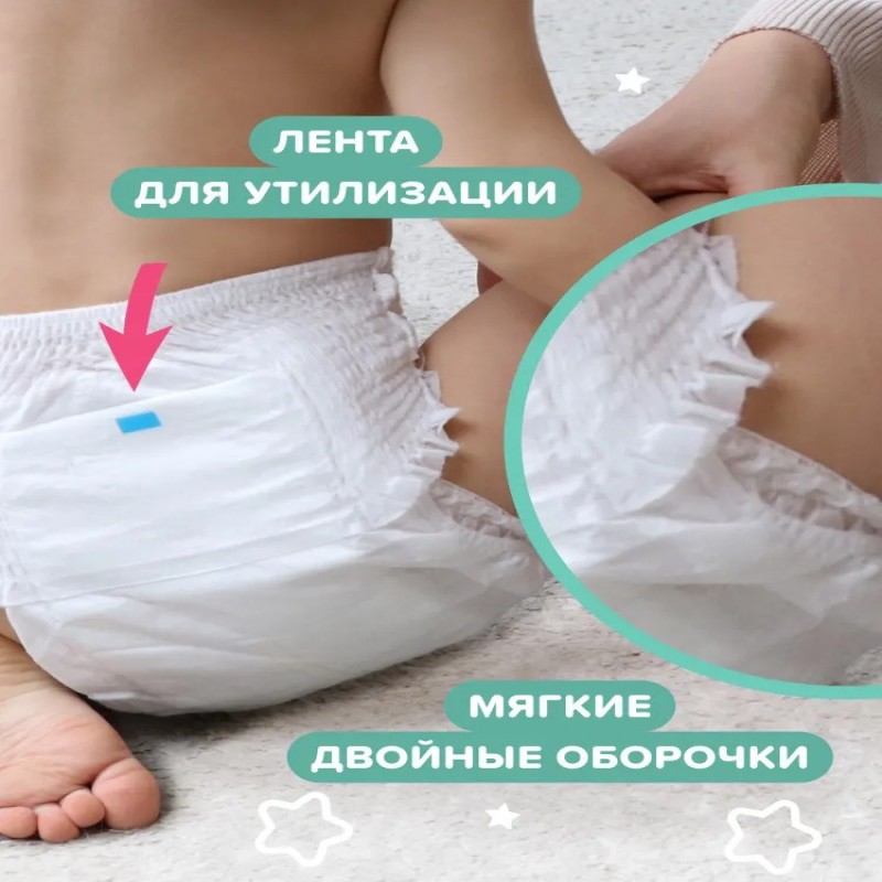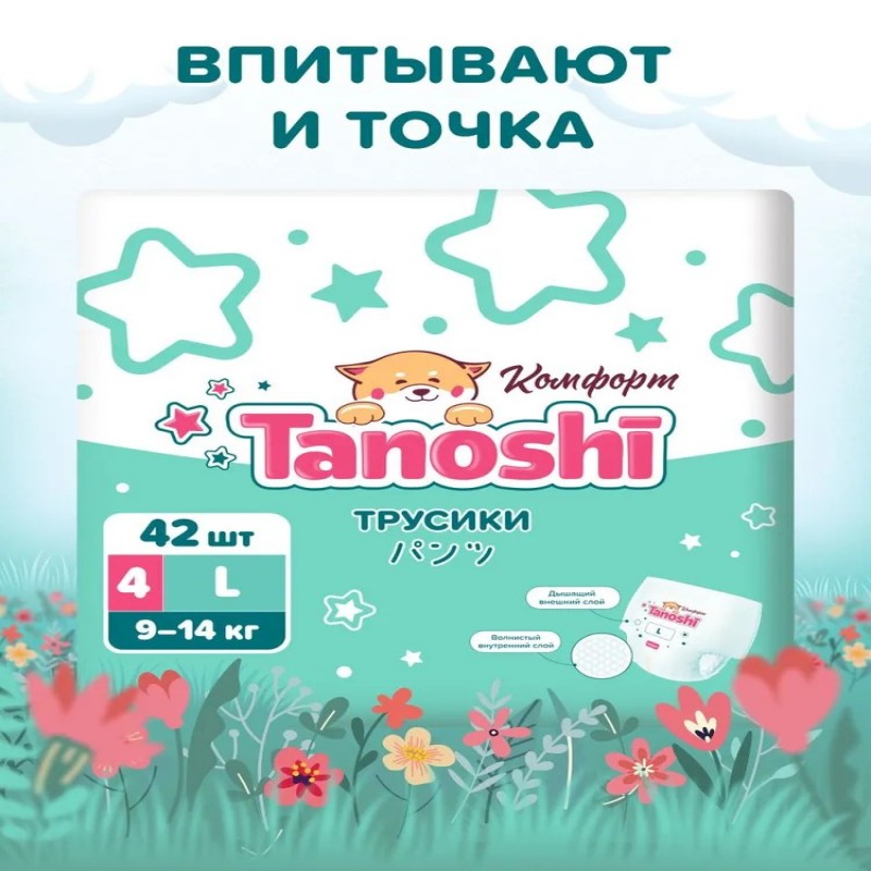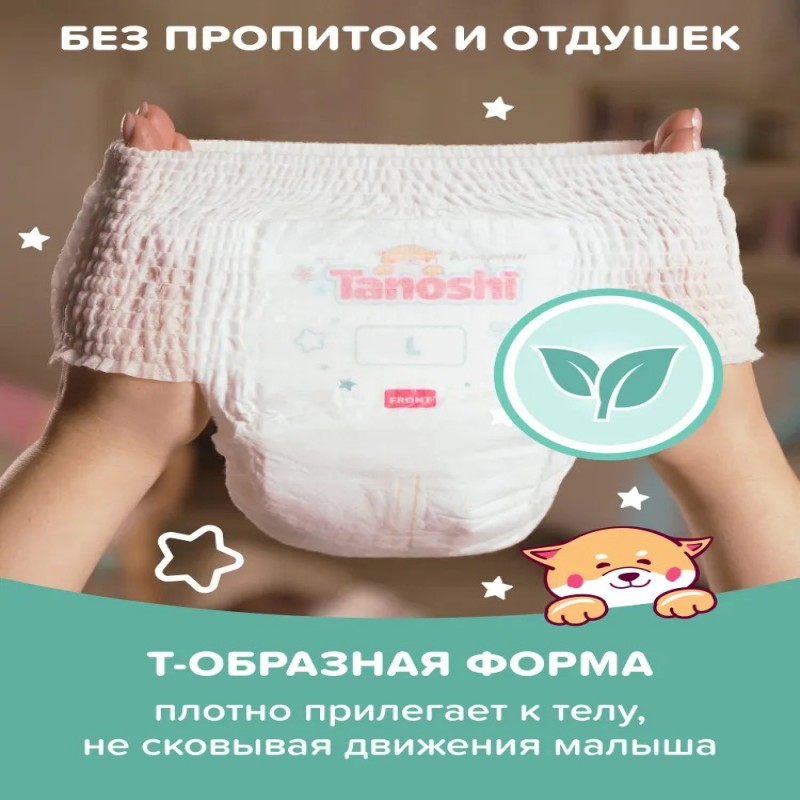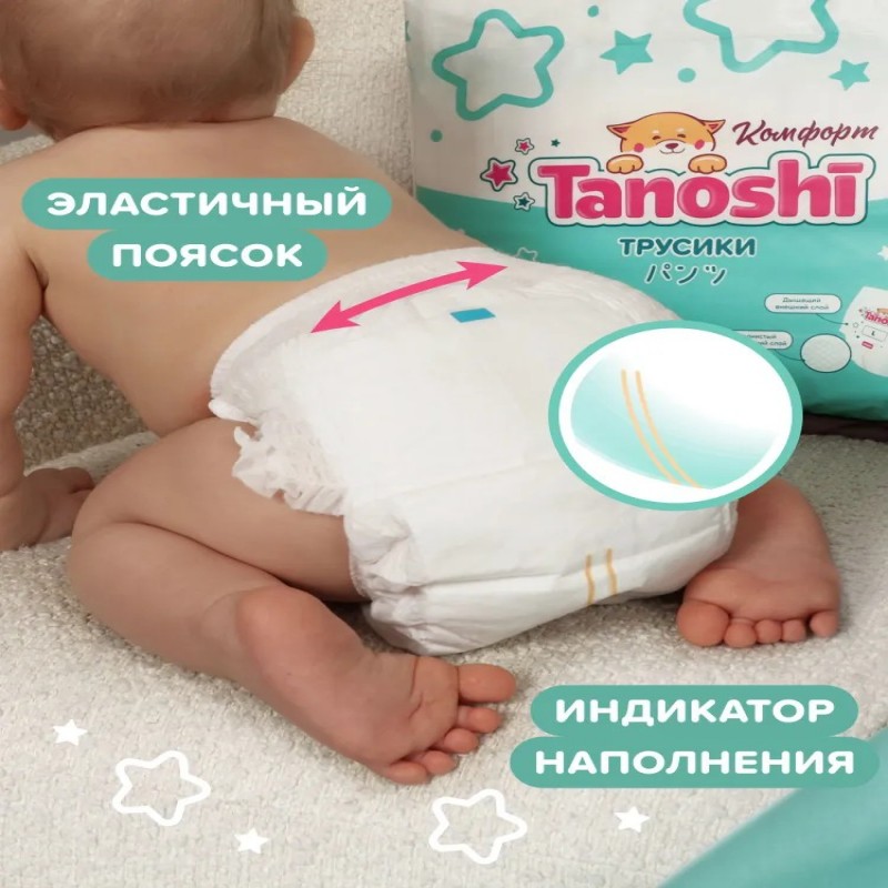 Детские подгузники трусики Tanoshi Комфорт – ультратонкие одноразовые впитывающие трусики японского качества по доступной цене. Подгузники трусики 4 размера (L) предназначены для детей с весом 9-14 кг. Безопасные, без ароматизаторов и пропитки, гипоаллергенные трусики Таноши сохраняют кожу ребёнка сухой и здоровой. Имеют Т-форму и не стесняют движений малыша, который активно ползает и делает первые шаги. Удобно снимаются, одеваются и не сползают во время ношения. Нетканое волокно из природной целлюлозы, произведённое по технологии AirLaid («воздушная укладка»), позволяет делать Таноши Комфорт ультратонкими, но при этом отлично впитывающими и не протекающими. Полимер из микса разных абсорбентов обеспечивает мгновенную впитываемость и равномерное распределение влаги по всей поверхности трусиков без образования комка между ножек. Волнистый внутренний слой минимизирует контакт нежной кожи малыша с поверхностью подгузника и предотвращает растекание жидкого стула. Дышащий внешний слой обеспечивает выведение прелого воздуха, оставляя при этом всю влагу внутри впитывающего слоя. С Tanoshi Комфорт кожа малыша защищена от опрелостей, раздражения и «парникового эффекта» без присыпок и детского крема под подгузник. Двойные мягкие оборочки вокруг ножек малыша и эластичная резиночка на пояске хорошо прилегают к телу ребёнка, не давят на ножки и животик и защищают от протеканий. Цветной индикатор наполнения подскажет, когда трусы подгузники пора заменить на новые. Мягкий боковой шов легко разрывается при замене трусиков, а лента утилизации позволяет аккуратно свернуть даже переполненный подгузник. Одинаково хорошо подходят для мальчиков и для девочек, для тёплого времени года, когда хочется одеть ребёнка полегче, и для холодного, когда и без подгузника количество слоёв одежды значительно увеличивается. Таноши Комфорт отличаются от линеек Tanoshi Стандарт и Tanoshi Premium по крою, форме и материалам, используемым при производстве. Однако их выбор по-прежнему опирается на лучшие разработки последних лет в изготовлении детских подгузников и многолетний опыт экспертов в области товаров для детской гигиены. Для нас важно, чтобы для своего ребёнка вы могли выбирать качественные подгузники при любых финансовых возможностях. Tanoshi Комфорт – лучший выбор молодых и активных родителей, для которых доказанное качество и понятная стоимость важнее популярного названия марки.