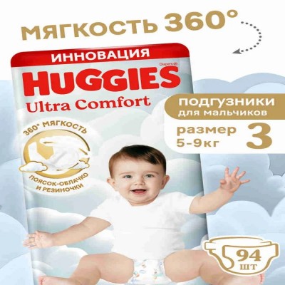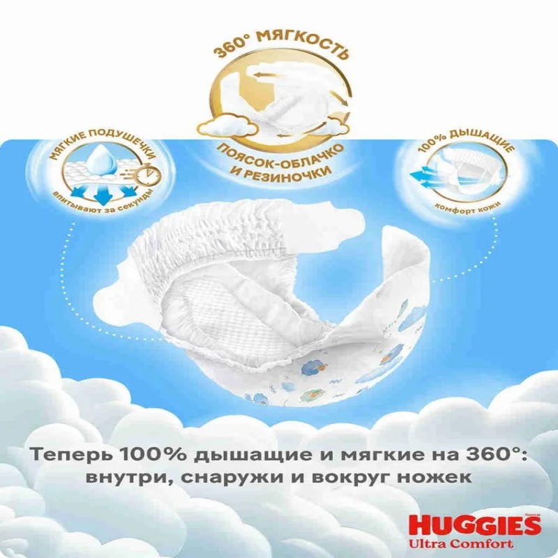Новые подгузники Huggies Ultra Comfort для мальчиков дарят мягкость на 360°: ультрамягкие внутри и снаружи, они словно облачко обнимают вашего малыша. Сделанные из нежных материалов резиночки вокруг ножек и воздушный поясок-облачко снижают давление на кожу и риск появления натираний и красных следов даже при длительном ношении, при этом надёжно фиксируя подгузники на ребёнке.