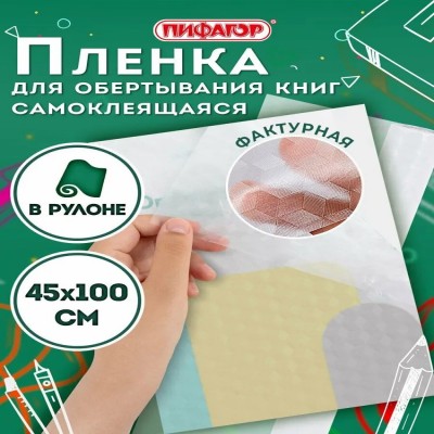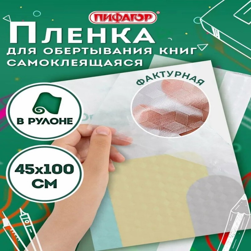 Пленка самоклеящаяся ПИФАГОР - идеальное решение для защиты ваших книг, учебников и тетрадей. Эта универсальная пленка толщиной 80 мкм сохраняет обложки в идеальном состоянии, защищая их от грязи и мелких механических повреждений. Прозрачная фактурная пленка подходит для любых форматов, позволяя легко оформить как обложку для учебника, так и обложку для тетради или дневника. Простота в использовании гарантирует, что вы сможете быстро и аккуратно наклеить пленку на обложку, обеспечив надежную защиту. Длина рулона 100 см и ширина 45 см позволяют обрабатывать множество учебных материалов. С этой пленкой ваши учебники и тетради будут выглядеть как новые, а процесс оформления станет легким и приятным. Не упустите возможность обеспечить долговечность своих книг с помощью этой высококачественной пленки для обложек!