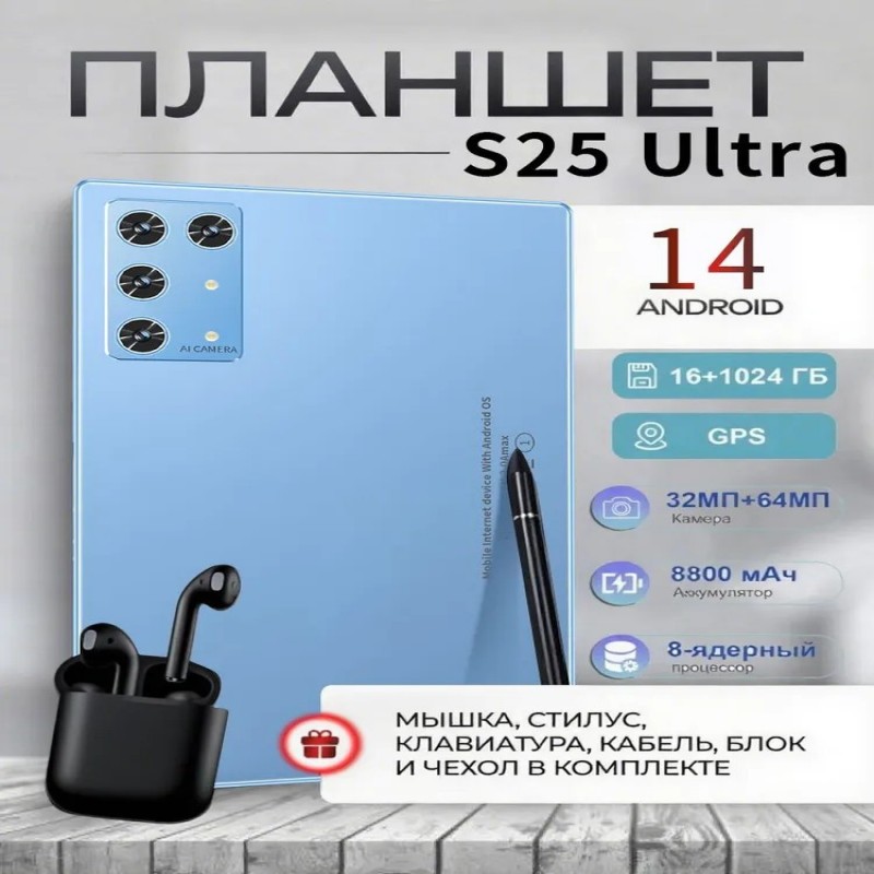 КомплектацияПланшет*1, зарядное устройство*1, клавиатура*1, стилус*1, защитный чехол*1, защитная пленка*1, изысканная упаковка*1,Кабель-переходник*1,Bluetooth-гарнитура*1,Динамик Bluetooth*1