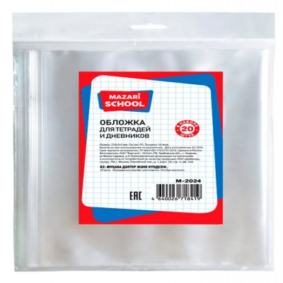Обложка Mazari изготовлена из высококачественного полипропилена, который обеспечивает долговечность и прочность материала. Толщина изделия составляет 50 мм, что позволяет использовать его как для дневников, так и для тетрадей. Оформление обложки - прозрачное, что делает ее универсальной и удобной. Размер составляет 21 x 34,5 см, что соответствует стандартному размеру школьных тетрадей и дневников. Обложка может использоваться как для учебных материалов, так и для личного применения. Комплектация набора - 20 обложек, что позволяет использовать их в течение длительного времени.