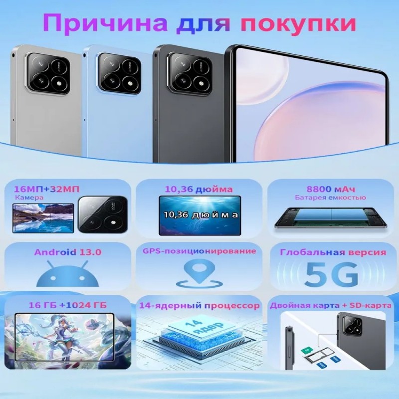 Планшет Игровой планшет имеет диагональ 10,36 дюйма и поддерживает рус
