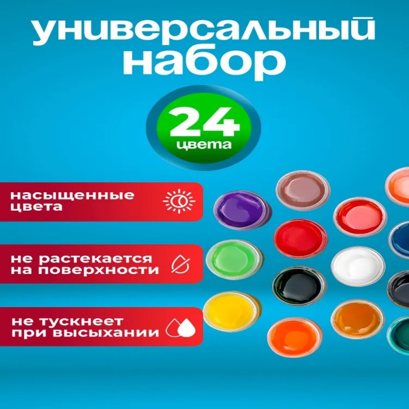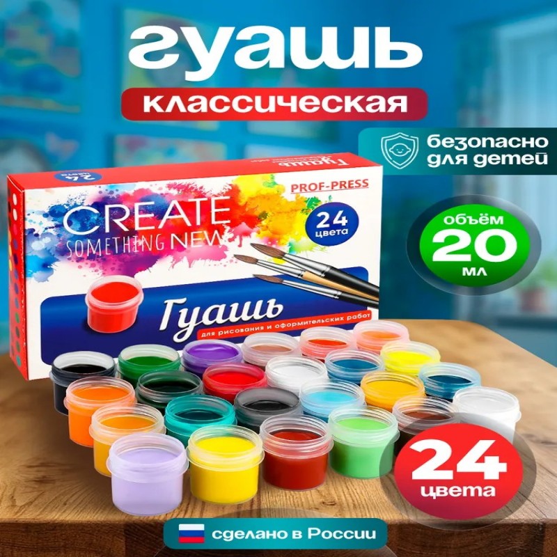 Краски гуашь идеально подходят для рисования. Художественная гуашь будет полезна как детям, так и взрослым. Комплект включает 24 ярких насыщенных цветов, что делает его удобным для творческих занятий. Этот вид школьной канцелярии отлично подходит для уроков рисования в школе , а также домашнего творчества. Эта художественная гуашь с 24 яркими цветами станет великолепным выбором в школу или садик. Универсальная палитра оттенков прекрасно подходит для юных художников и профессионалов, позволяя оживить любые творческие идеи благодаря своим натуральным компонентам на водной основе. Объем каждой баночки составляет 20 мл, что делает их удобными для домашнего использования и школьных уроков. Гуашь обладает множеством преимуществ: после высыхания поверхность становится матовой и бархатистой, а краски не растекаются и устойчивы к свету. Без неприятного запаха, поэтому можно спокойно заниматься творчеством вместе с малышами. Набор отлично подойдет в качестве детских и канцелярских принадлежностей как для малышей, мальчиков, так и для девочек. Эти краски станут ценным дополнением коллекции любого маленького художника или школьника. Профессиональная продукция дарит возможность создавать шедевры не только на бумаге и картоне, но также впечатляюще выглядит на холсте, дереве и стекле. Покупая канцелярию от Prof-Press для детей, Вы обеспечиваете их учебный процесс комфортом – желание к учебе растет и ребенок допускает меньше ошибок. Например, в слове гуаш. Гуашь набор обладает качественной формулой.
