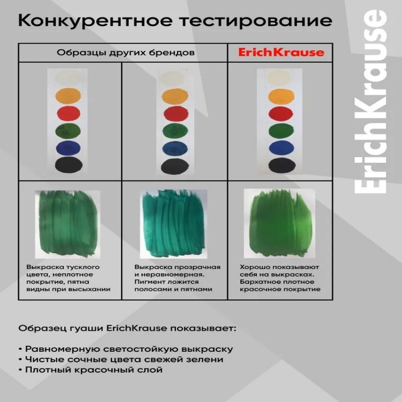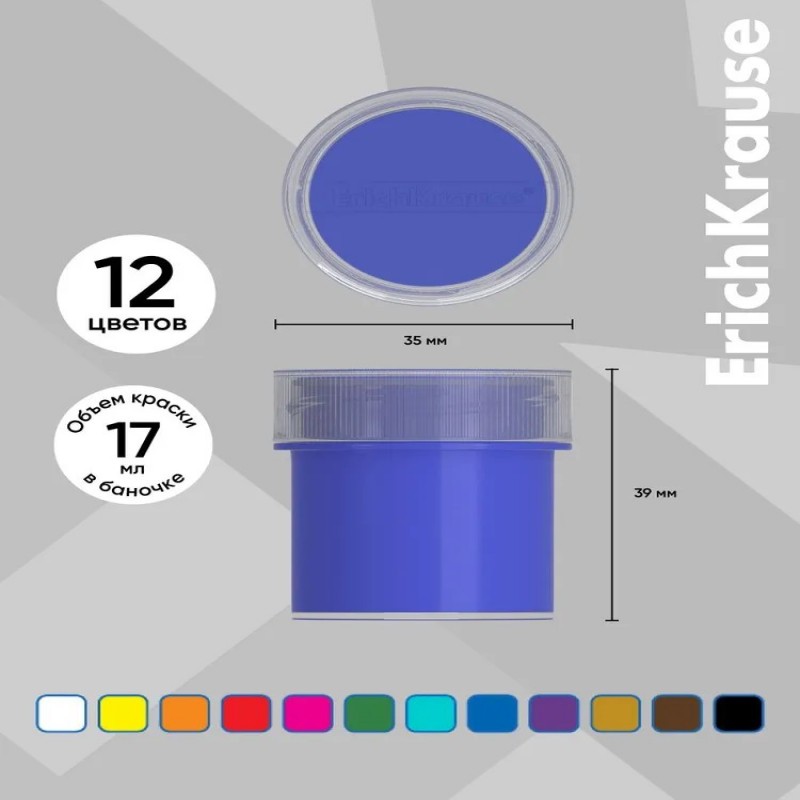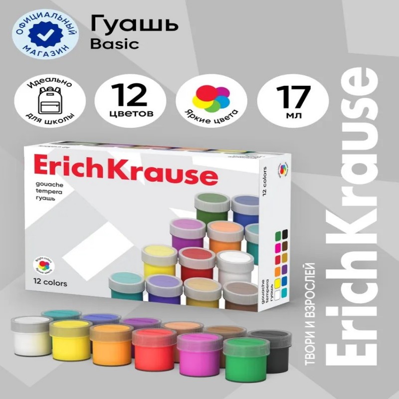 Гуашь ErichKrause®. Рисунки, выполненные такими красками, дольше сохраняют сочные цвета. Гуашь обладает насыщенными плотными цветами с высокой укрывистостью, при рисовании ровно ложится на бумагу и быстро высыхает, после высыхания рисунок приобретает матово-бархатистую поверхность.