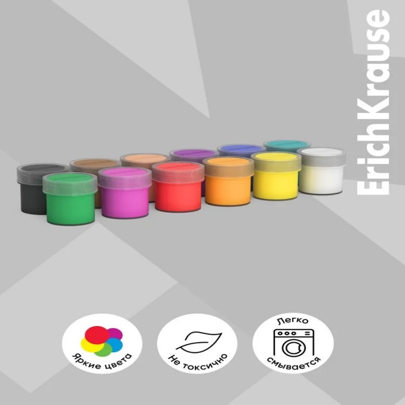 Безопасная гуашь ErichKrause® на водной основе, легко смывается с рук и отстирывается с большинства видов ткани и бытовых поверхностей, она не токсична, изготавливается из экологичных материалов.
