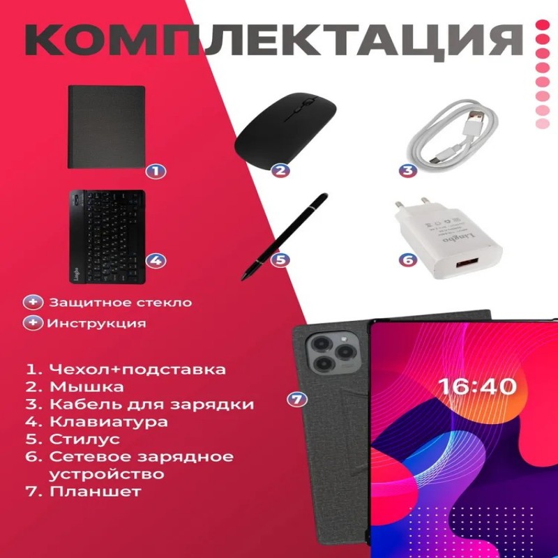 Планшет, USB-C кабель, стилус, чехол, беспроводная клавиатура, защитное стекло, проводная мышка, переходник USB-A - USB-C, инструкция