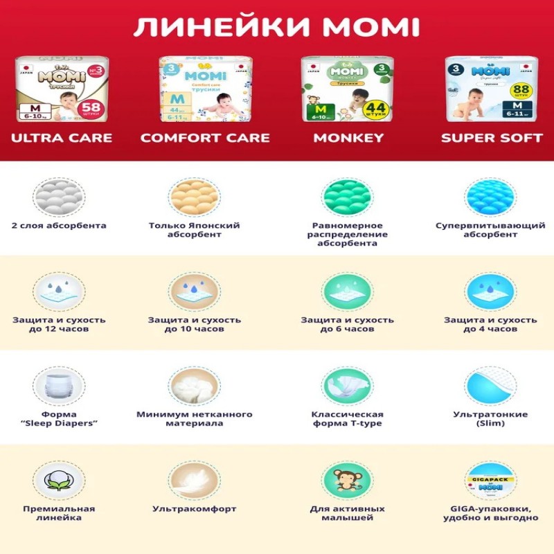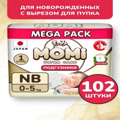 Momi Подгузники для новорожденных 0-5 кг размер 1 NB 102шт ULTRA CARE