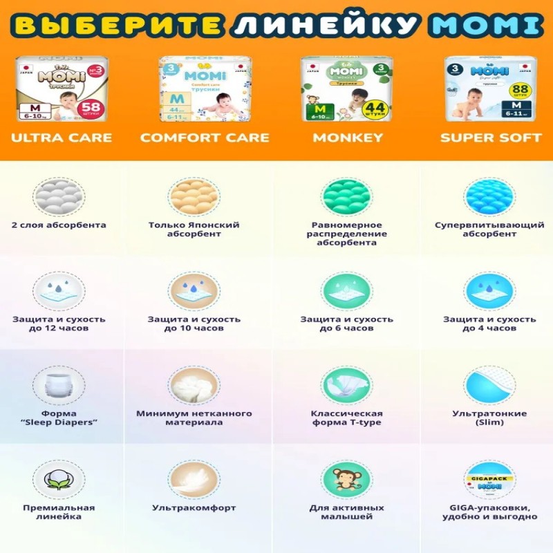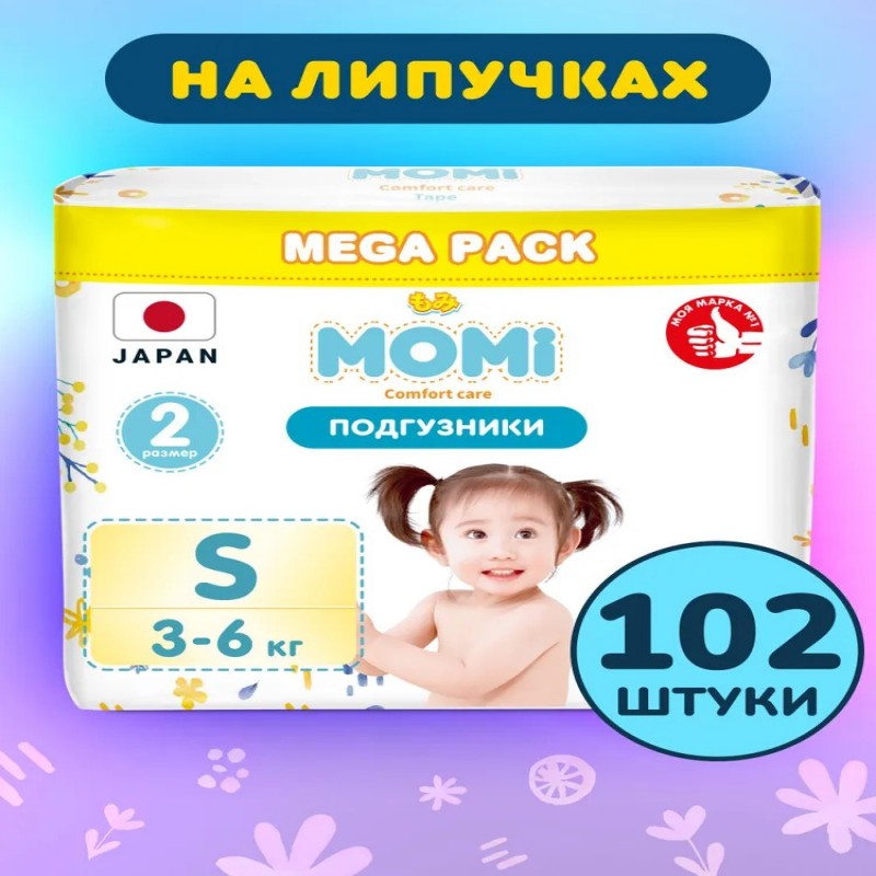 Momi Подгузники детские 3-6 кг размер 2 S 102шт Comfort Care MEGA pack