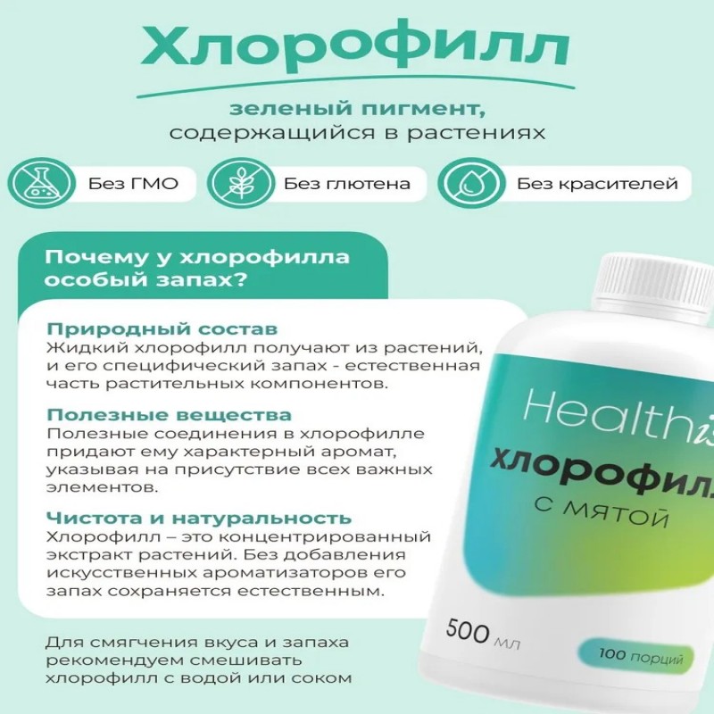 Состав медный комплекс хлорофилла натрия из люцерны, вода очищенная структурированная, растительный глицерин (носитель), сорбит (подсластитель), пищевой ароматизатор мята, сорбат калия (консервант). Роль каждого ингредиента читайте на изображениях! Способ применения Взрослым по 1 чайной ложке (5 мл) 1 раз в день с водой или соком. Перед употреблением взбалтывать. Показания Рекомендуется в качестве дополнительного источника хлорофилла и меди Хлорофилл Жидкий