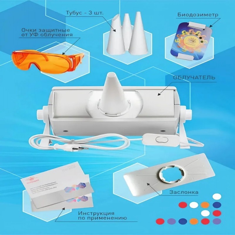 Облучатель ультрафиолетовый бактерицидный, Очки защитные от УФ облучения, Тубус - 3 шт., Биодозиметр, Руководство по эксплуатации с методами лечения, Инструкция по применению, Заслонка-1 шт.