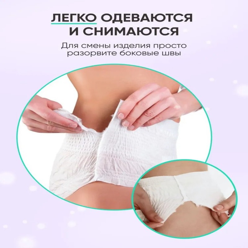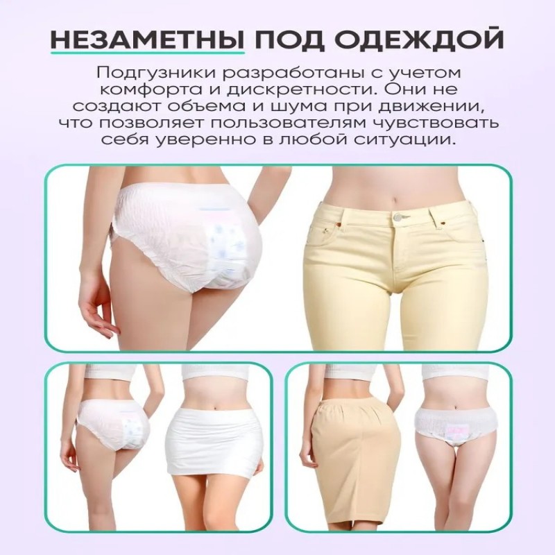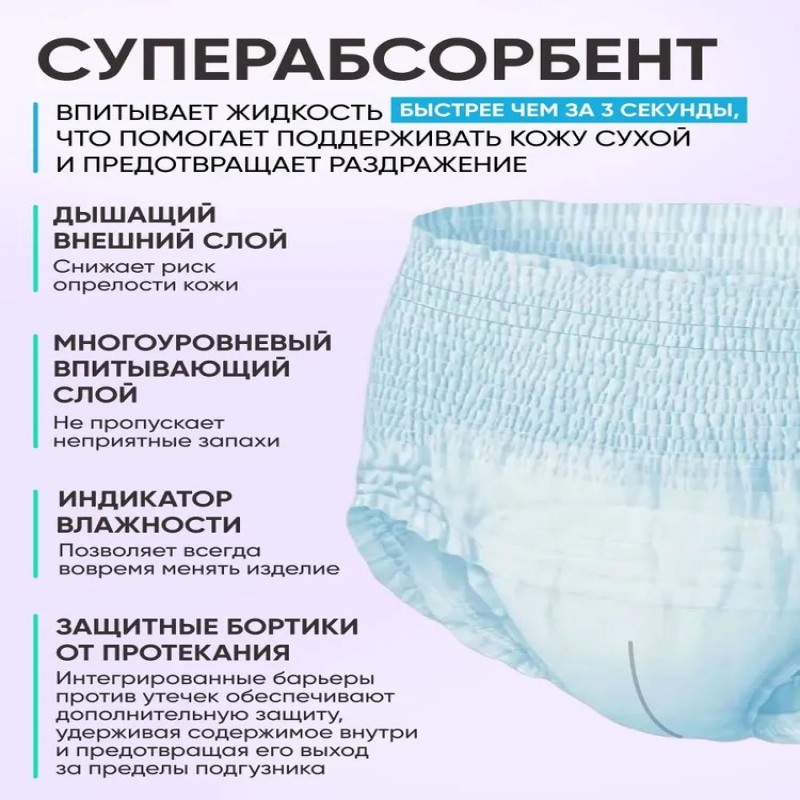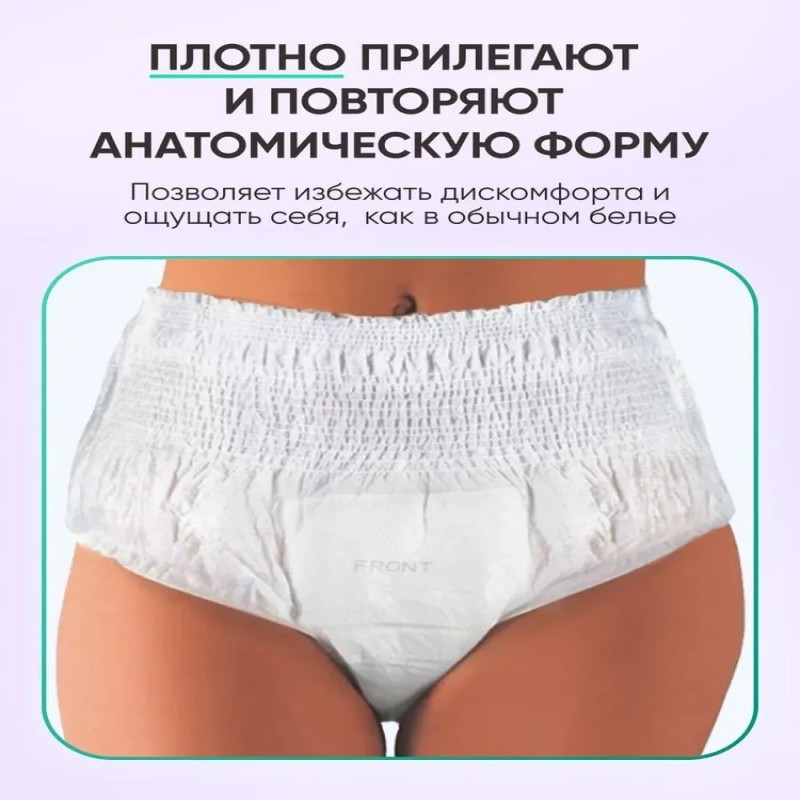Максимальный комфорт и защита: Наше белье обеспечивает не только исключительную впитываемость до 1785 мл, но и идеально подходит к контурам вашего тела, благодаря чему вы всегда будете чувствовать себя уверенно и комфортно.