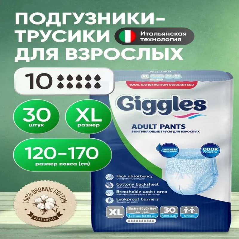 Трусы-подгузники для взрослых Giggles, размер XL, 30 шт. (обхват талии 120-170 см)