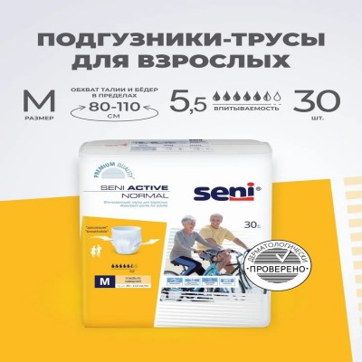 Впитывающие трусы Seni ACTIVE NORMAL (размер medium) предназначены для впитывания и удержания мочи у взрослых при средней форме недержания. Оптимальное решение для людей, ведущих активный образ жизни, а также для участников занятий по двигательной реабилитации. Мягкие и эластичные, надеваются и снимаются как обычное нижнее белье. Комфортно прилегают к телу и не ограничивают свободу движений.