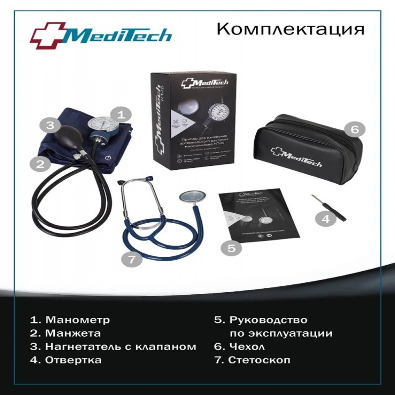 • манометр мембранный; • манжета компрессионная; • нагнетатель с клапаном; • стетоскоп; • отвертка; • руководство по эксплуатации; • чехол; • упаковочная коробка.