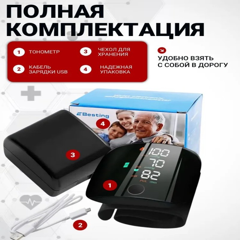 Комплектация- Тонометр автоматический: 1шт; - Футляр для хранения: 1шт; - USB-провод : 1шт; - Инструкция на русском языке.