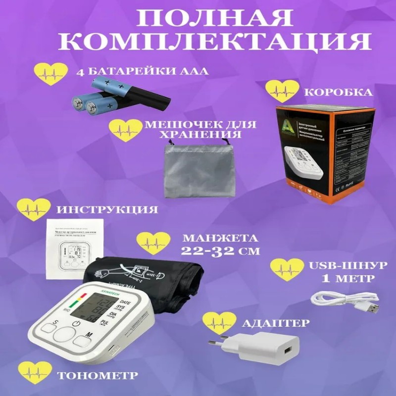 КомплектацияТонометр, манжета, инструкция на русском языке, мешочек для хранения, коробка, usb-кабель, адаптер, батарейки ААА (4 штуки).