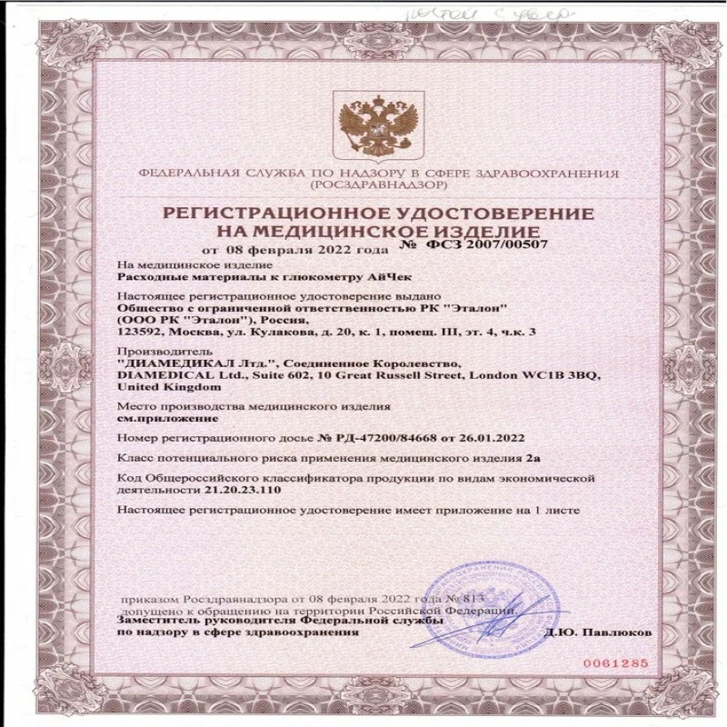 Тест-полоски Предназначены для самостоятельного контроля уровня сахара в крови. Специальный защитный слой позволяет прикасаться к любому участку тест-полоски. Для проведения теста достаточно одной капли крови. Результат будет готов через 9 секунд. Ланцеты Кодирующий стрип отсутствует и выведен из состава принадлежностей глюкометра. Если же он необходим, то обратитесь по номеру телефона указанному на упаковке. Комплектация Тест-полоска — 50 шт.