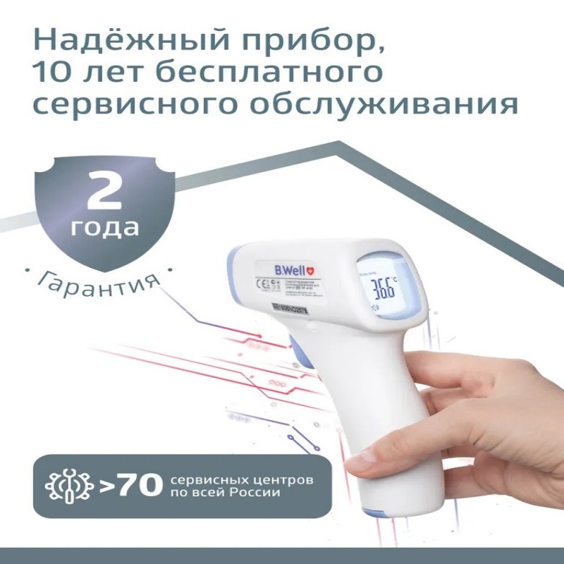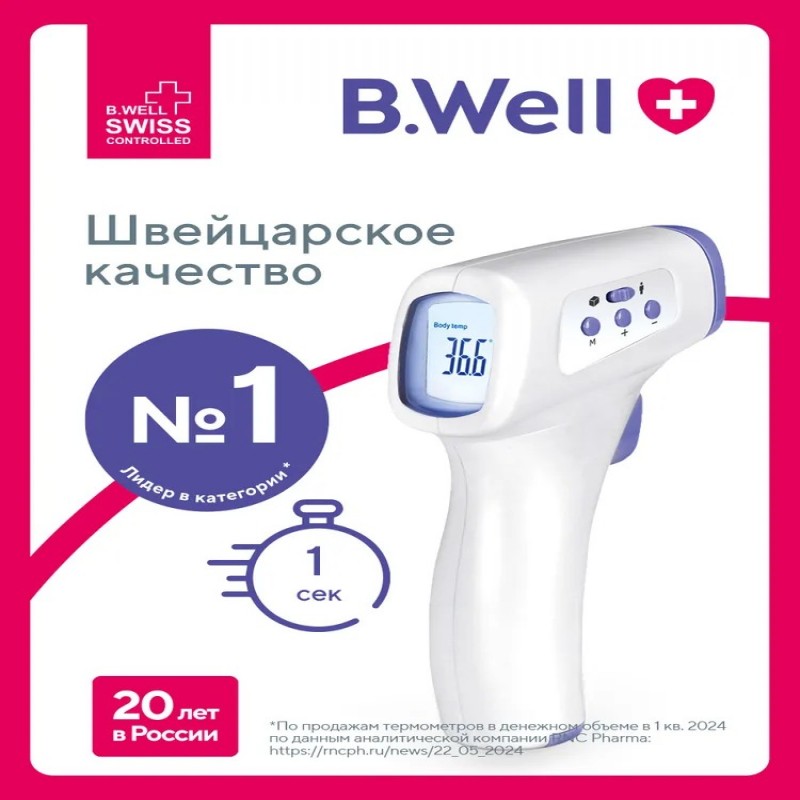 Более 70 сервисных центров в России. Ассортимент B.Well B.Well Swiss — это швейцарский производитель медицинских приборов с многолетней историей и безупречной репутацией. Миссия B.Well: создавать продукты, помогающие людям заботиться о близких и беречь здоровье своих родных, делая миллионы семей счастливыми. Компания учитывает потребности разных возрастов, стремясь помочь как малышам, так и пожилым людям. Каждый товар B.Well — это гарантия безупречного качества! Комплектация • Термометр медицинский электронный инфракрасный; • Элементы питания: 2 батареи 1,5 В типа АА; • Сумка-чехол; • Руководство по эксплуатации; • Гарантийный талон.