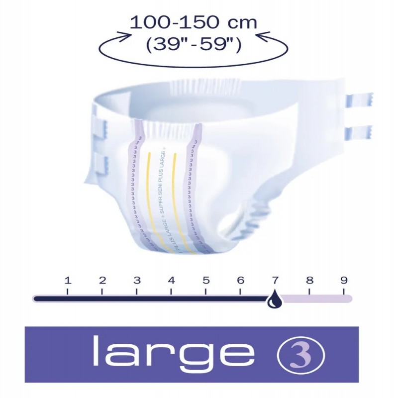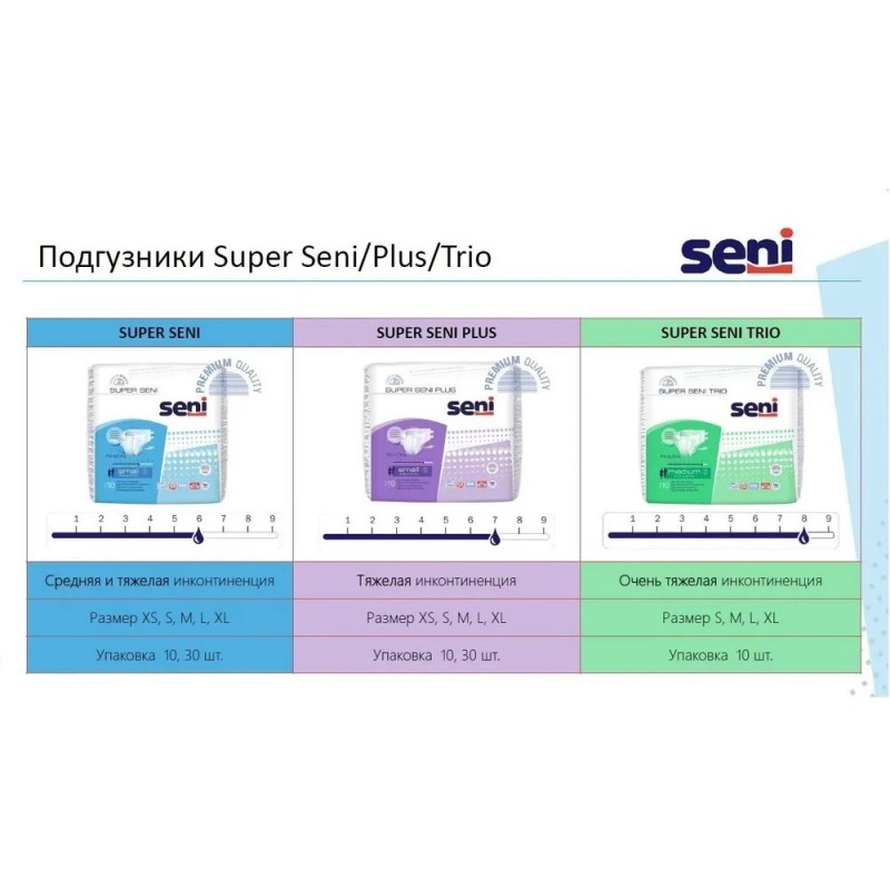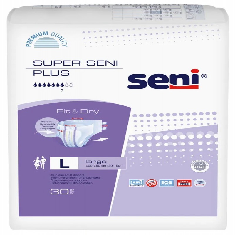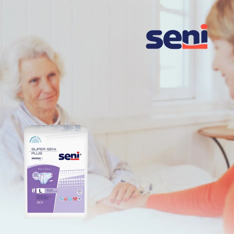 Seni "Super Seni Plus" – "дышащие" подгузники для защиты при средней и тяжелой степени недержания мочи, предназначены как для активных людей, так и для людей с ограниченными двигательными возможностями.