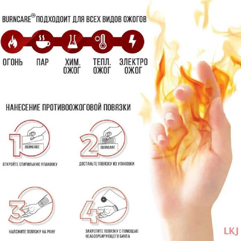 Противоожоговые салфетки BURNCARE спользуются в качестве первой медицинской помощи при ожогах 1, 2, и 3 степени, полученных от открытого огня, пара, воды, солнца, а так же при химических и электрических ожогах .